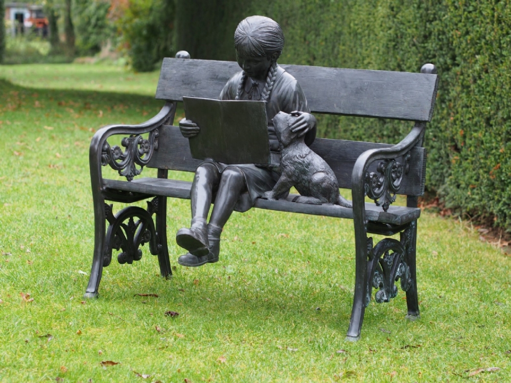 Bronzefigur af en pige siddende med sin hund på en bænk