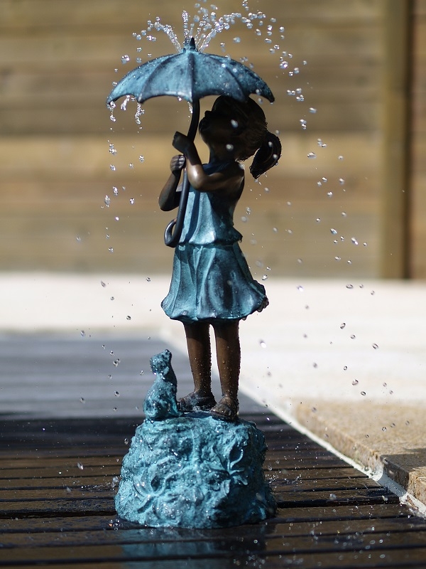 Pige med paraply lavet i bronze - Denne figur kan tilkobles en vandstenspumpe og nyd da figeren med vand.