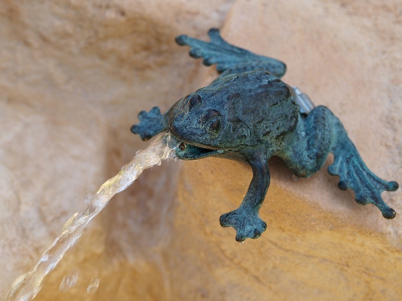 Lille frø som sprøjter med vand ud af munden, hvis den tilkobles en vandstenspumpe.