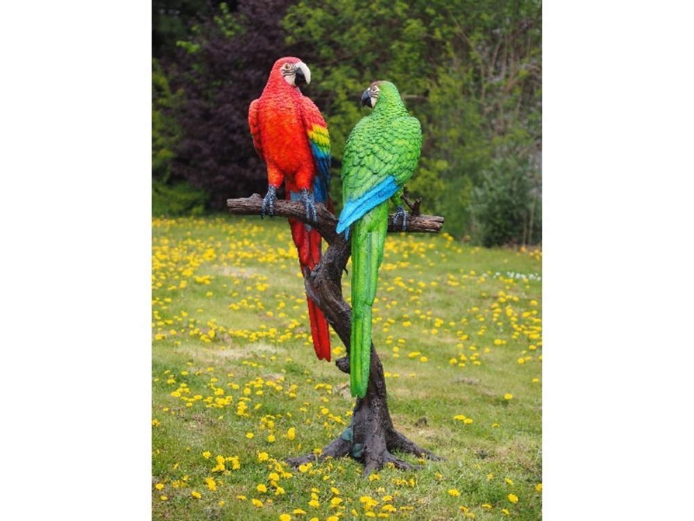 Bronzefigur 2 farverige papegøjer på træ