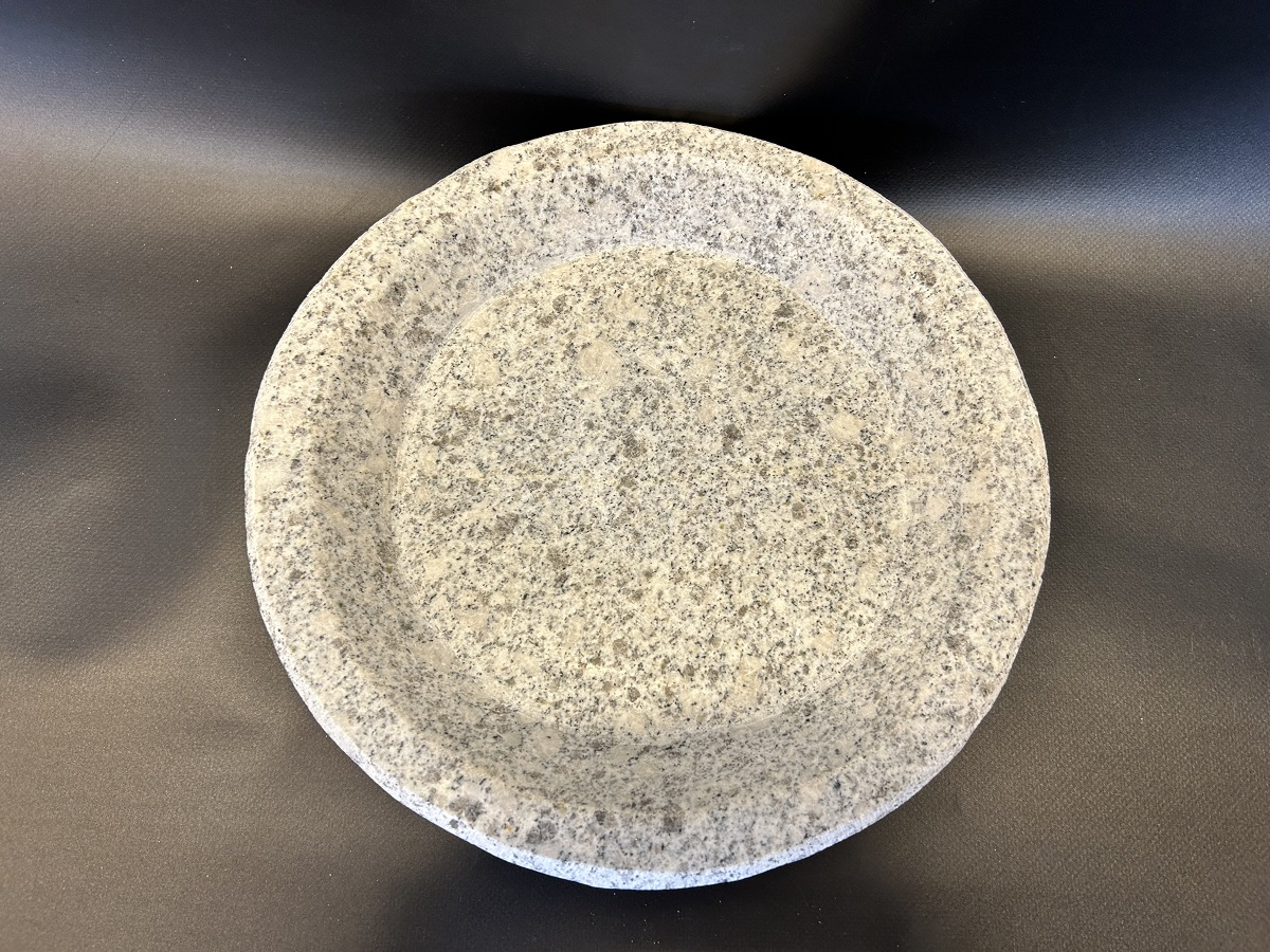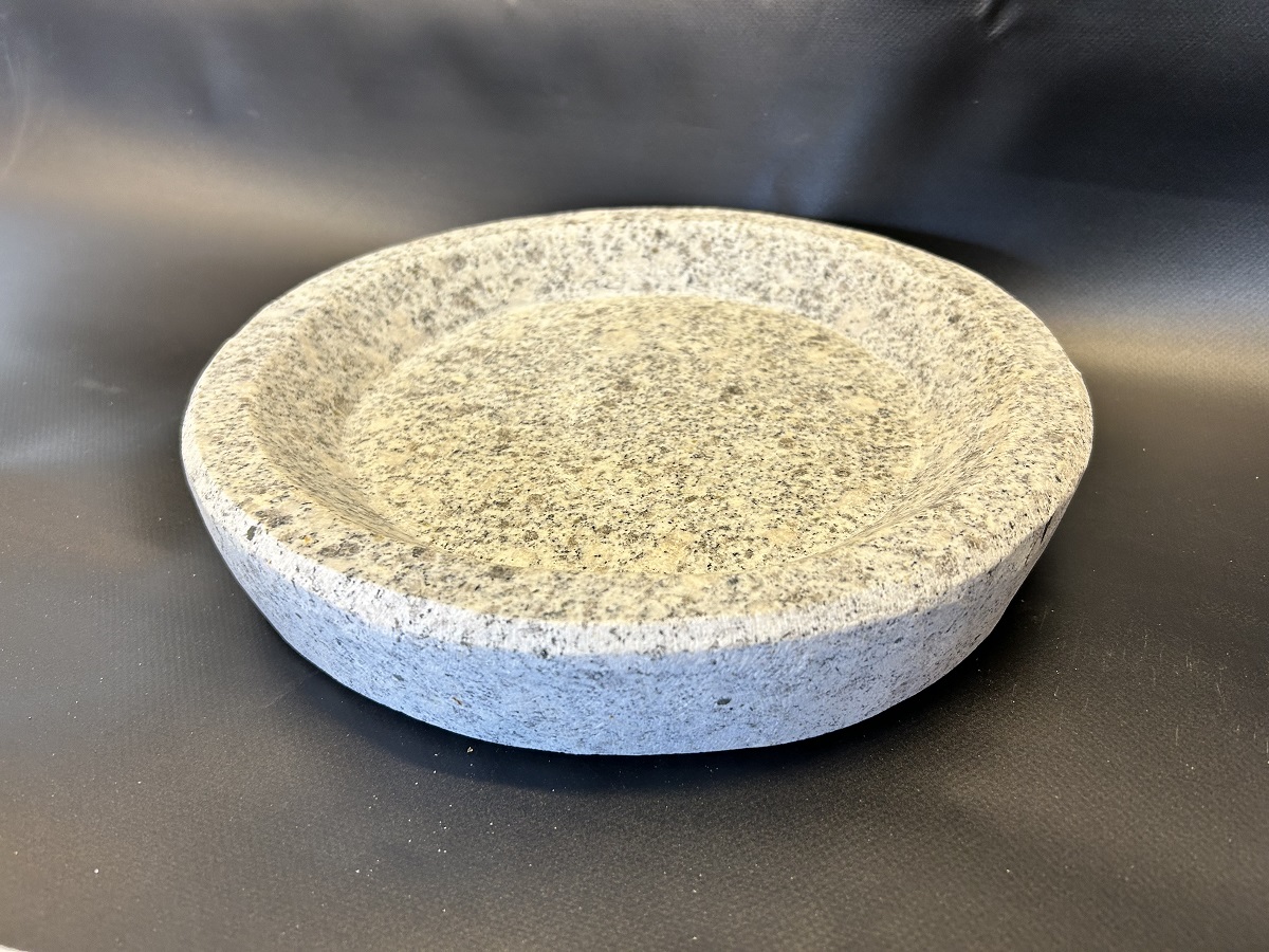 Fuglebad i lysegrå granit med poleret skål hvor kanter og underside er matslebet.