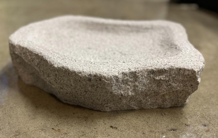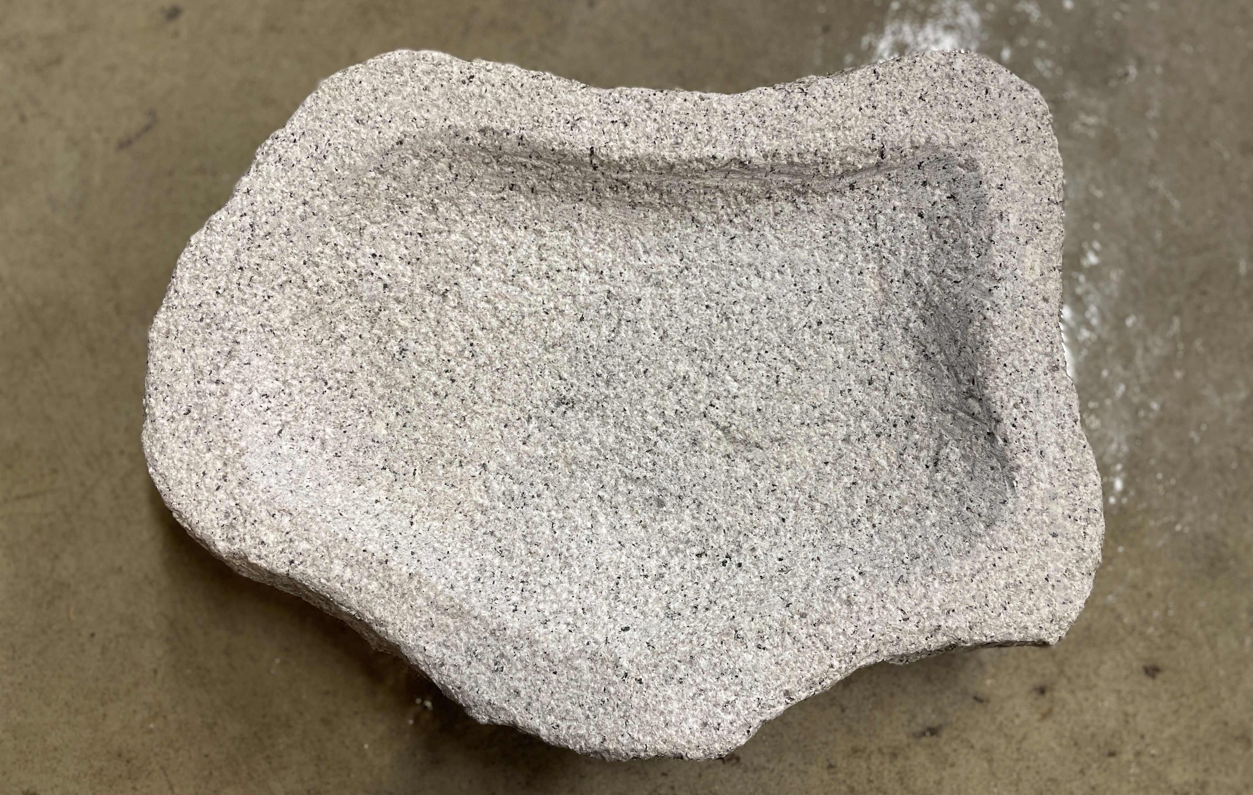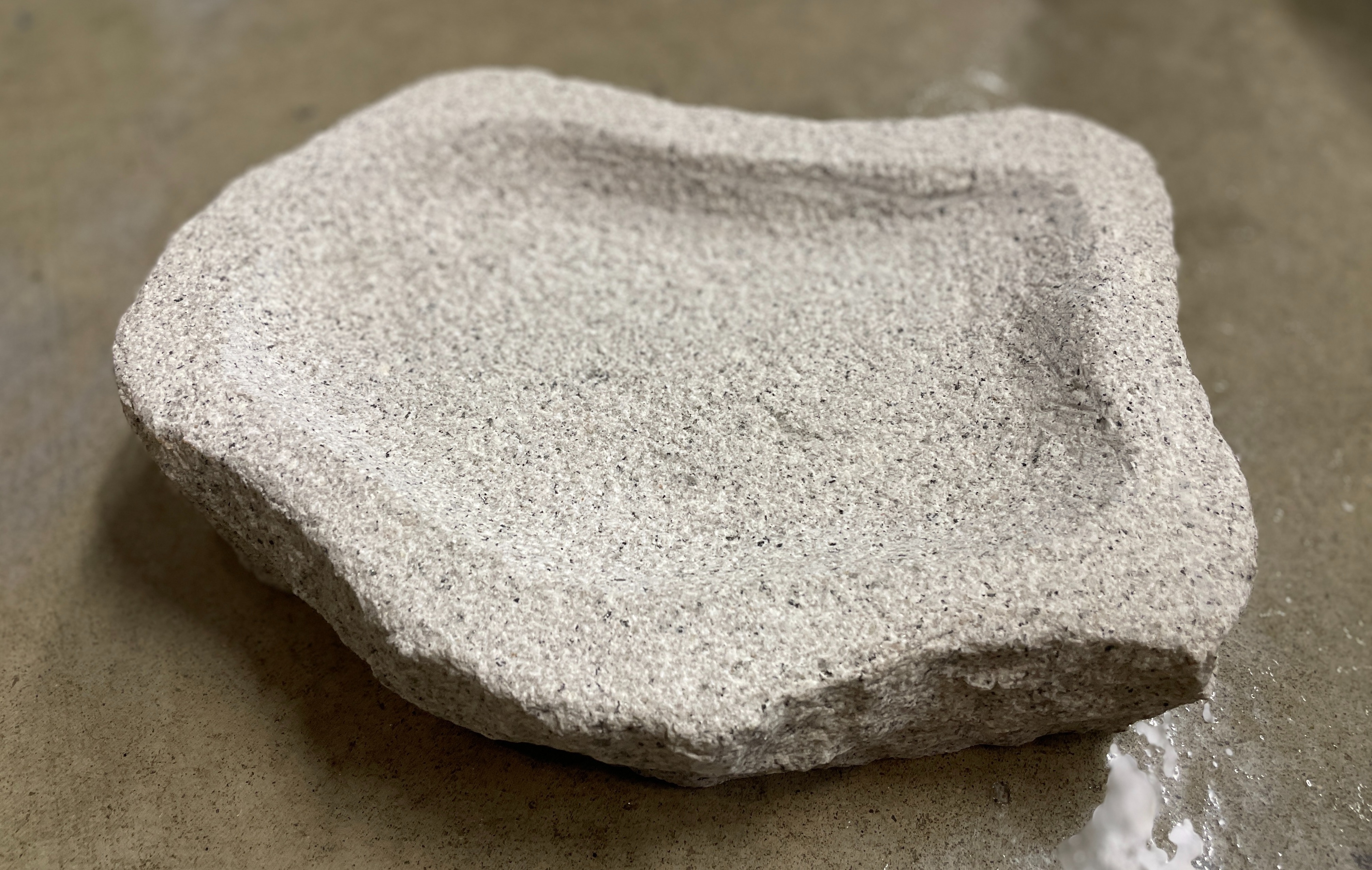 Den kløvede overflade gør at fuglebadet fremstår ru og rustik.