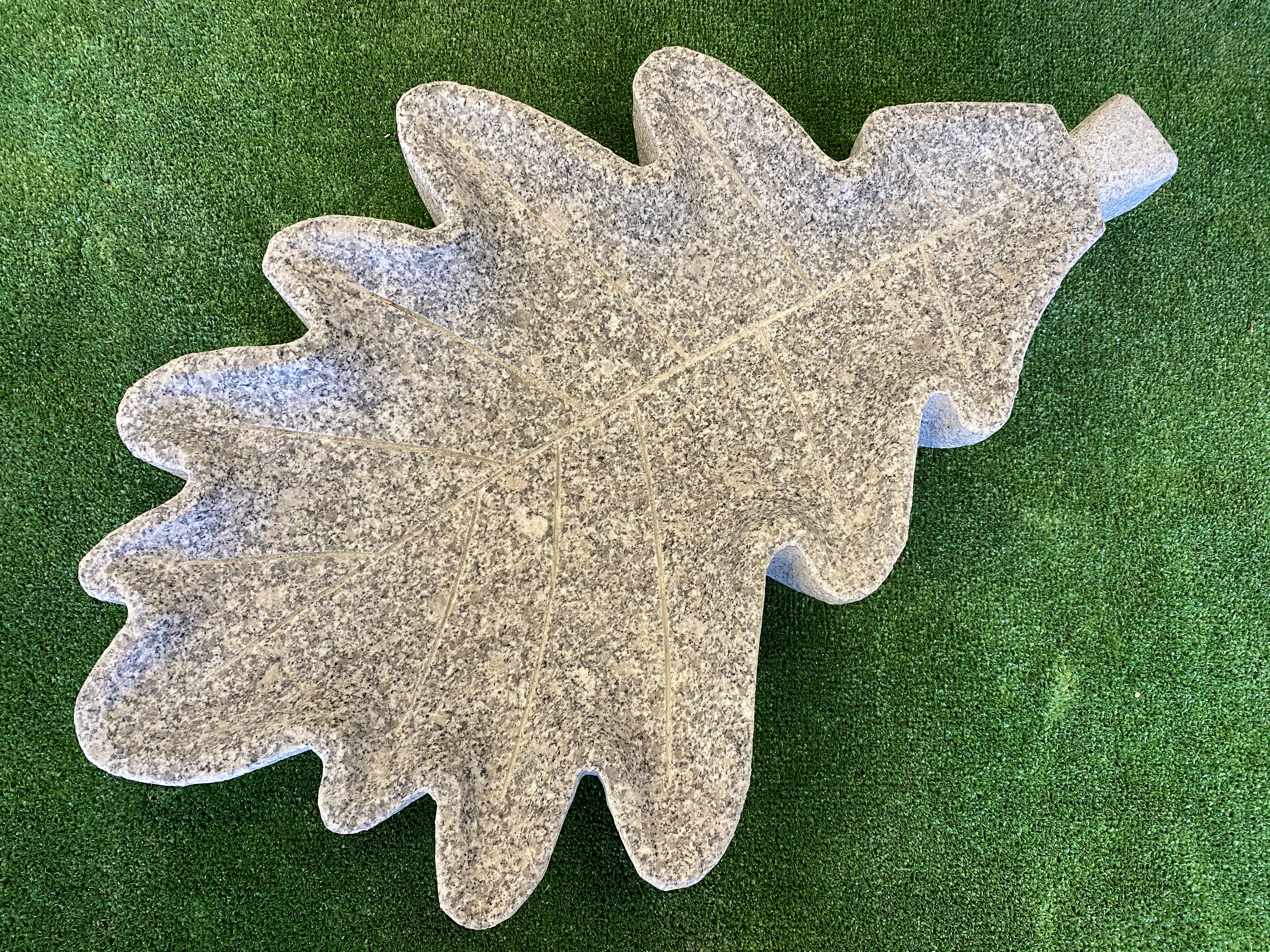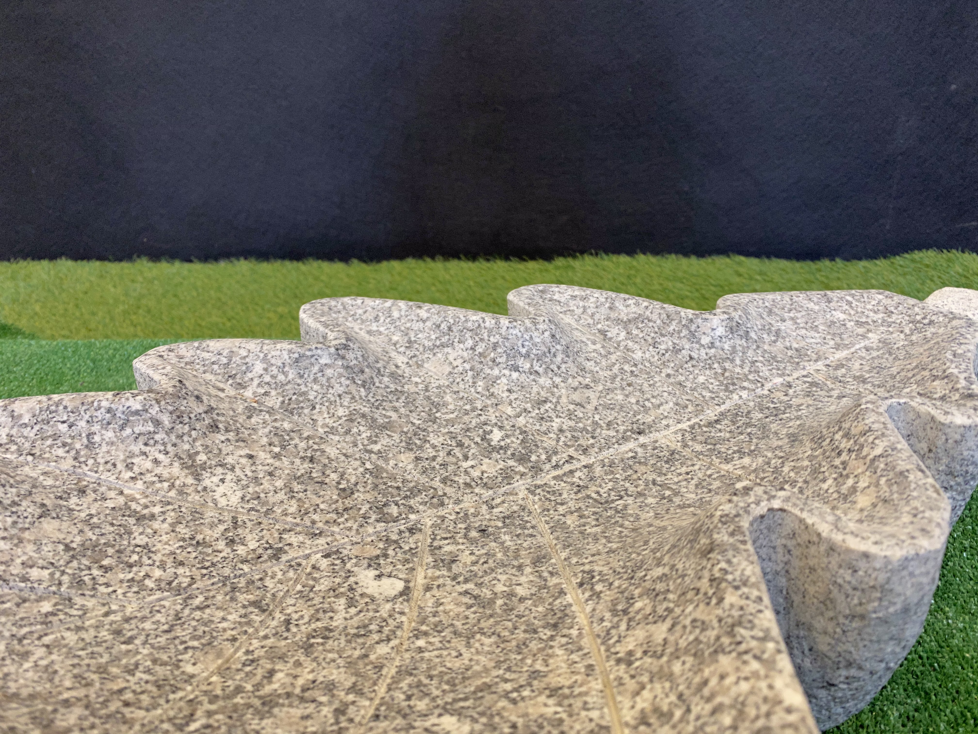 Fuglebad med form som egeblad lavet i lysegrå granit - skålen har en poleret overflade der frembringer granittens varierende farvespil.