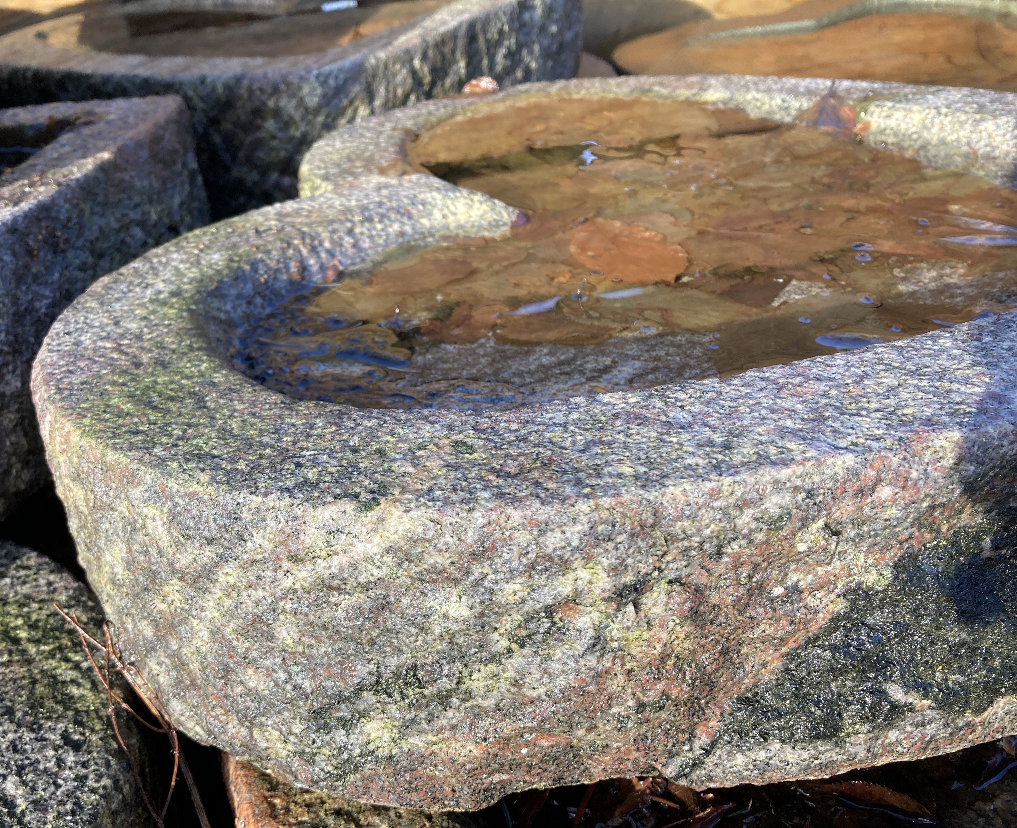 Fuglebadet har ru og rustikke overflade der skaber et naturligt udtryk.