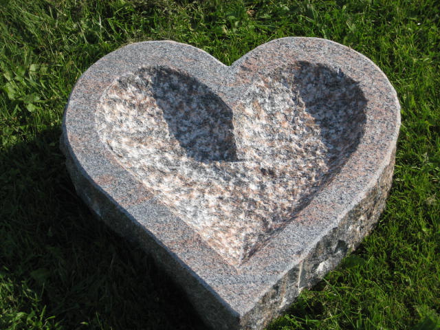 Hjerteformet granitfuglebad i rødlig/violet granit.
