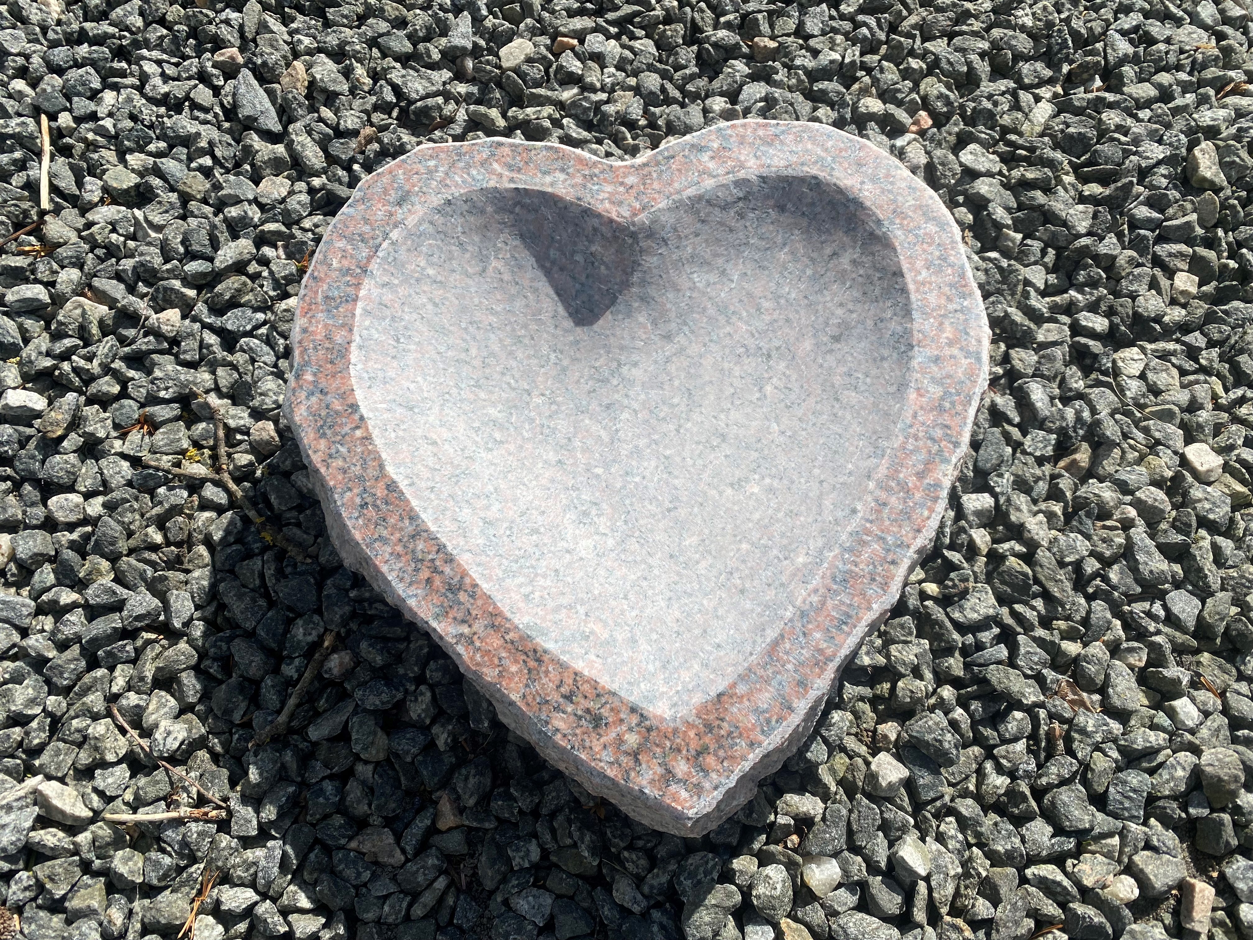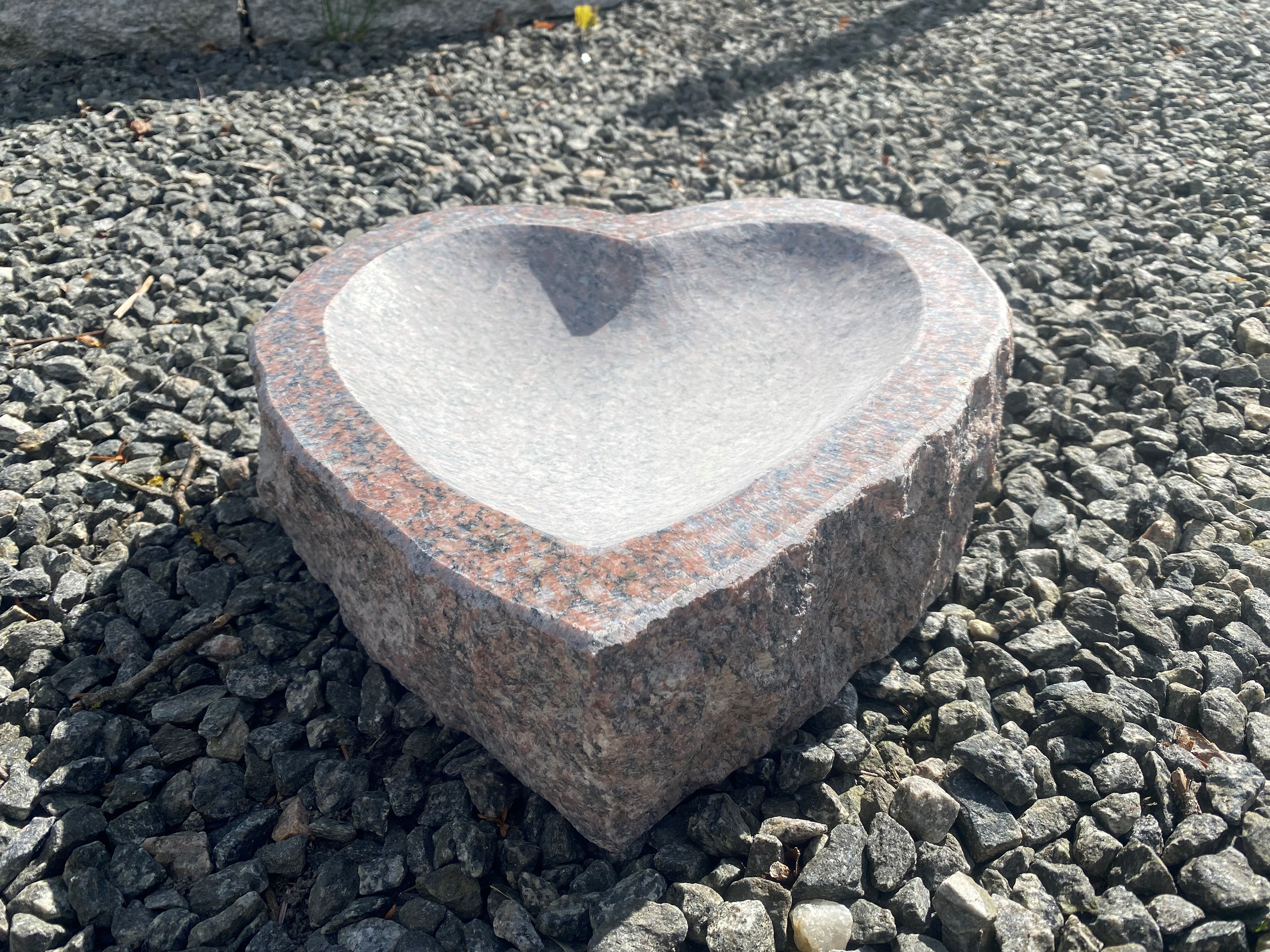 Fuglebadet har en hjerteform med polerede kanter i toppen og rå huggede sider.