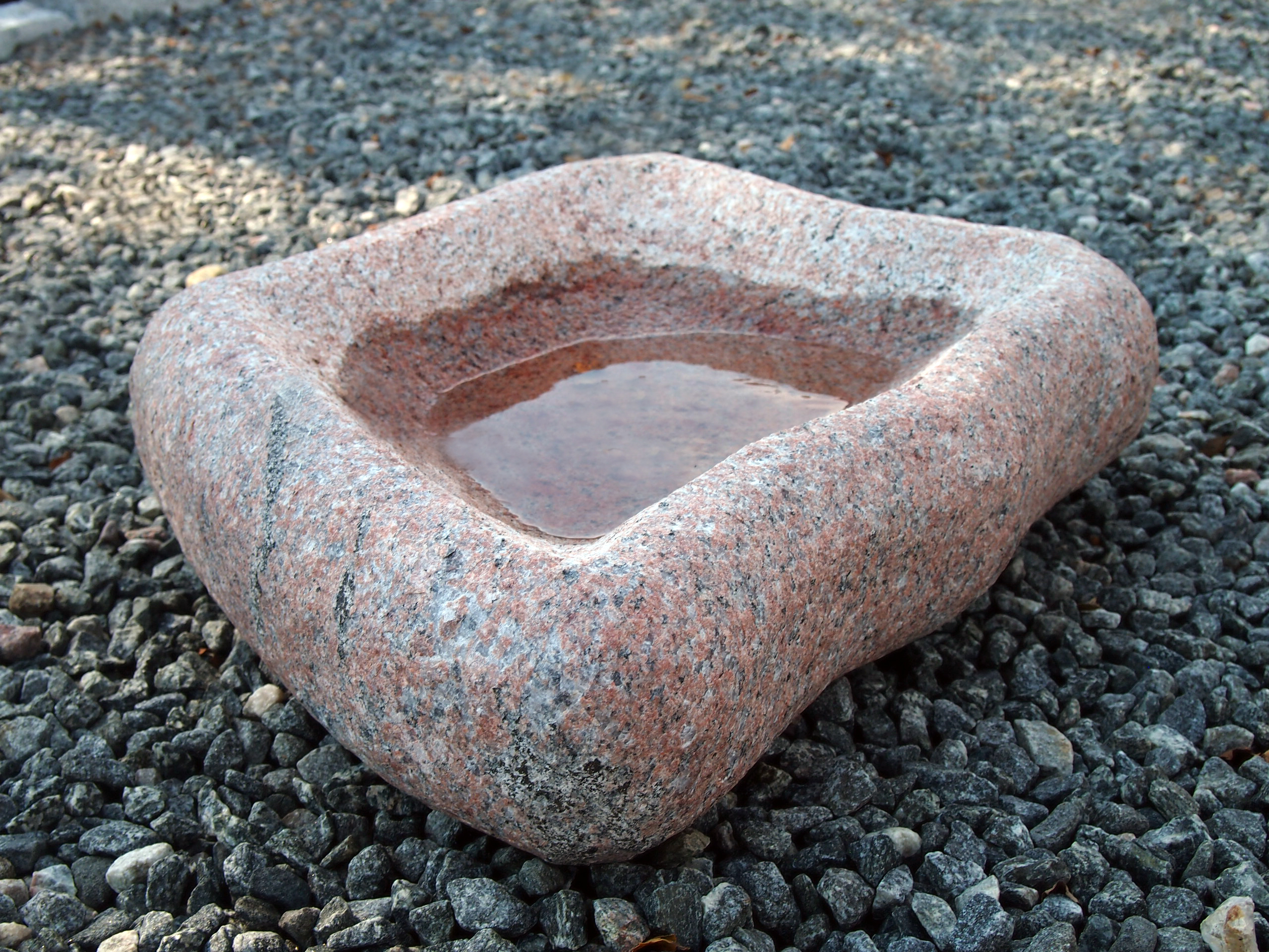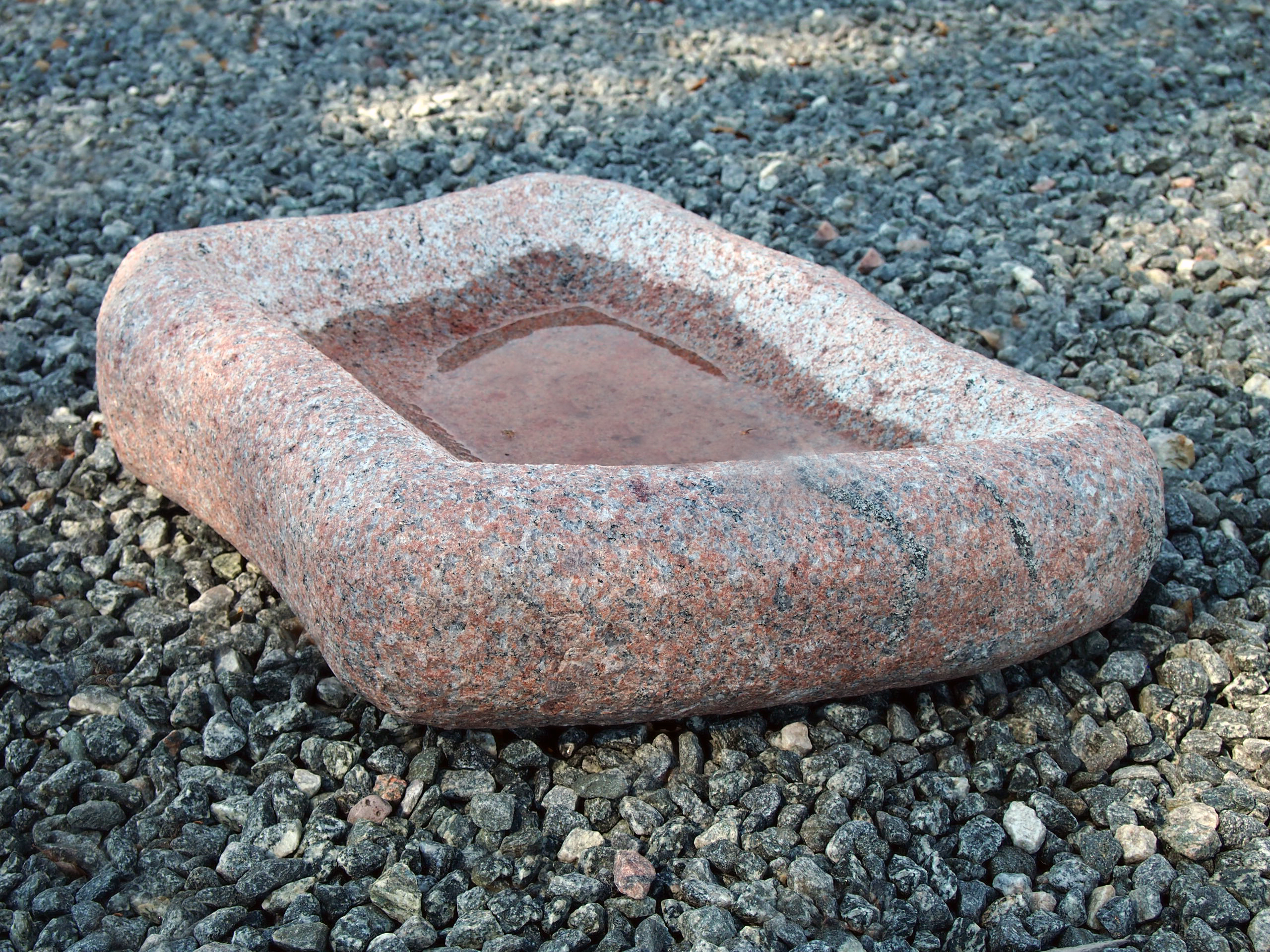 Rødlig indisk granit fuglebad med flotte åretegninger som særligt bliver synlige når stenen bliver våd