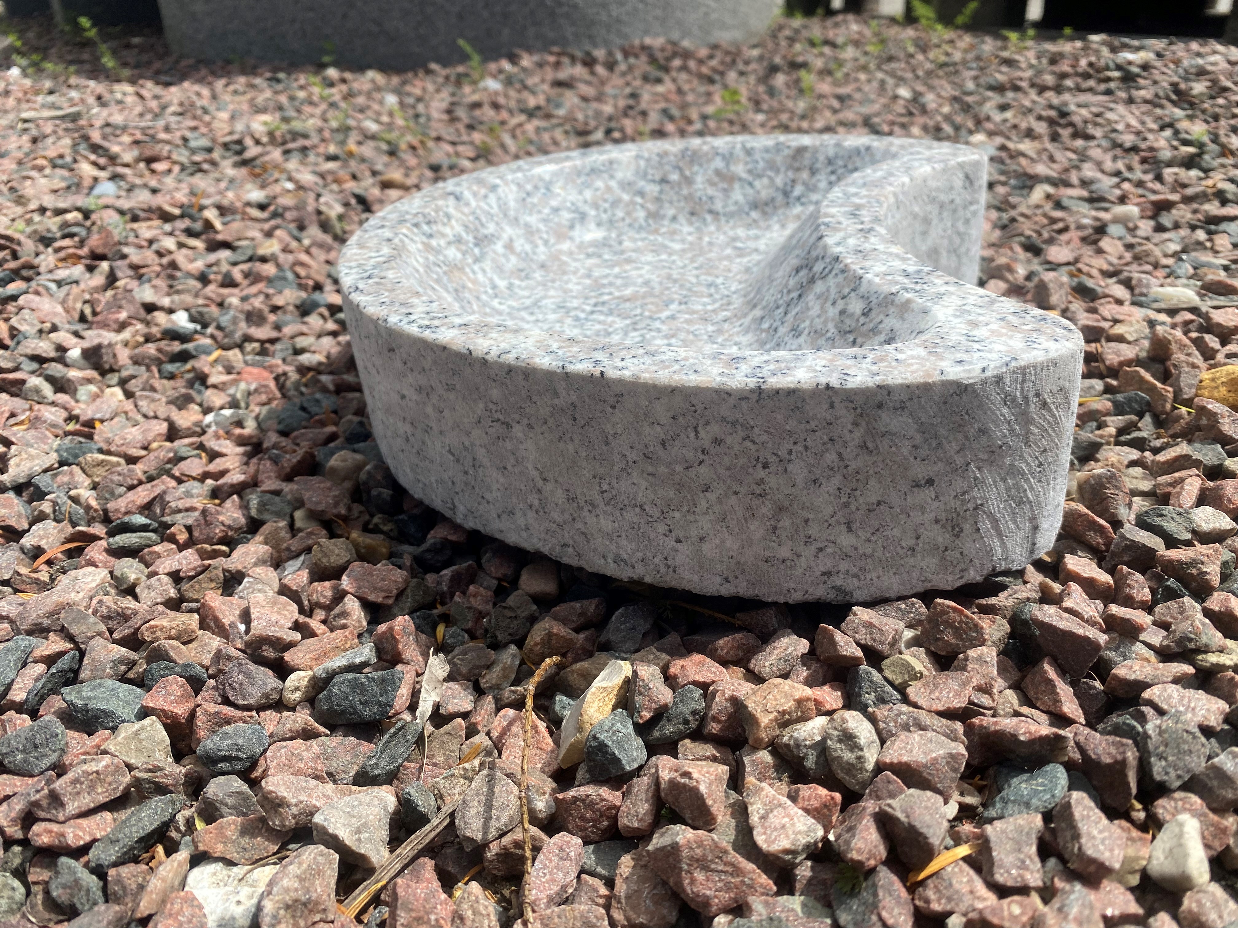 Fuglebadet har en poleret skål og savede sider - velegnet til fugleliv ved hus og have, og har også en fin størrelse til en kirkegårdsplads.