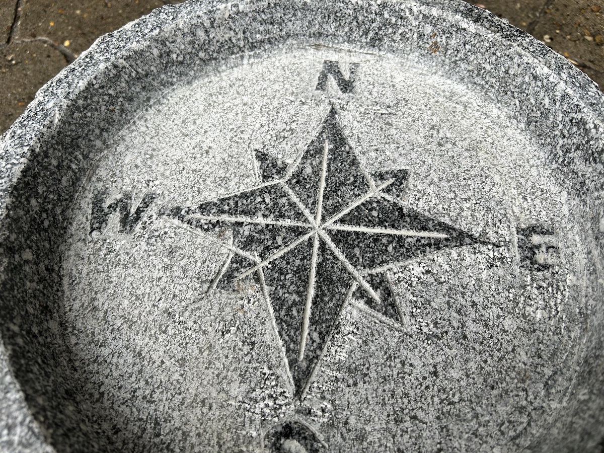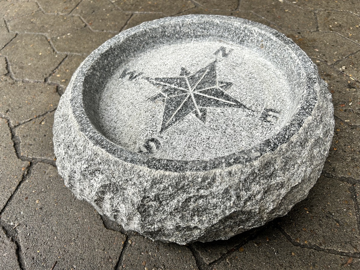 Fuglebad i gråsort granit med poleret kompasmotiv - N, S, E, W.
