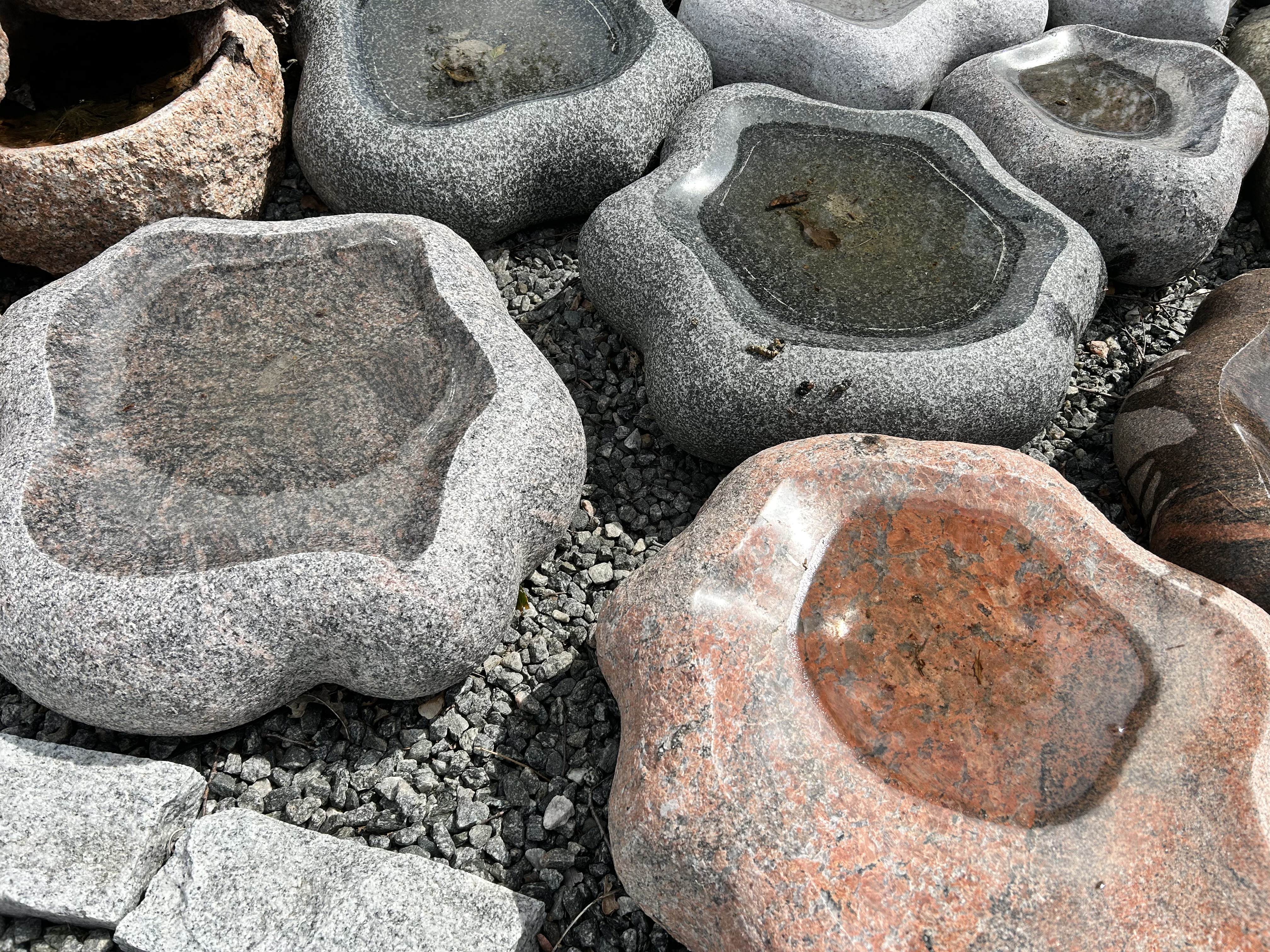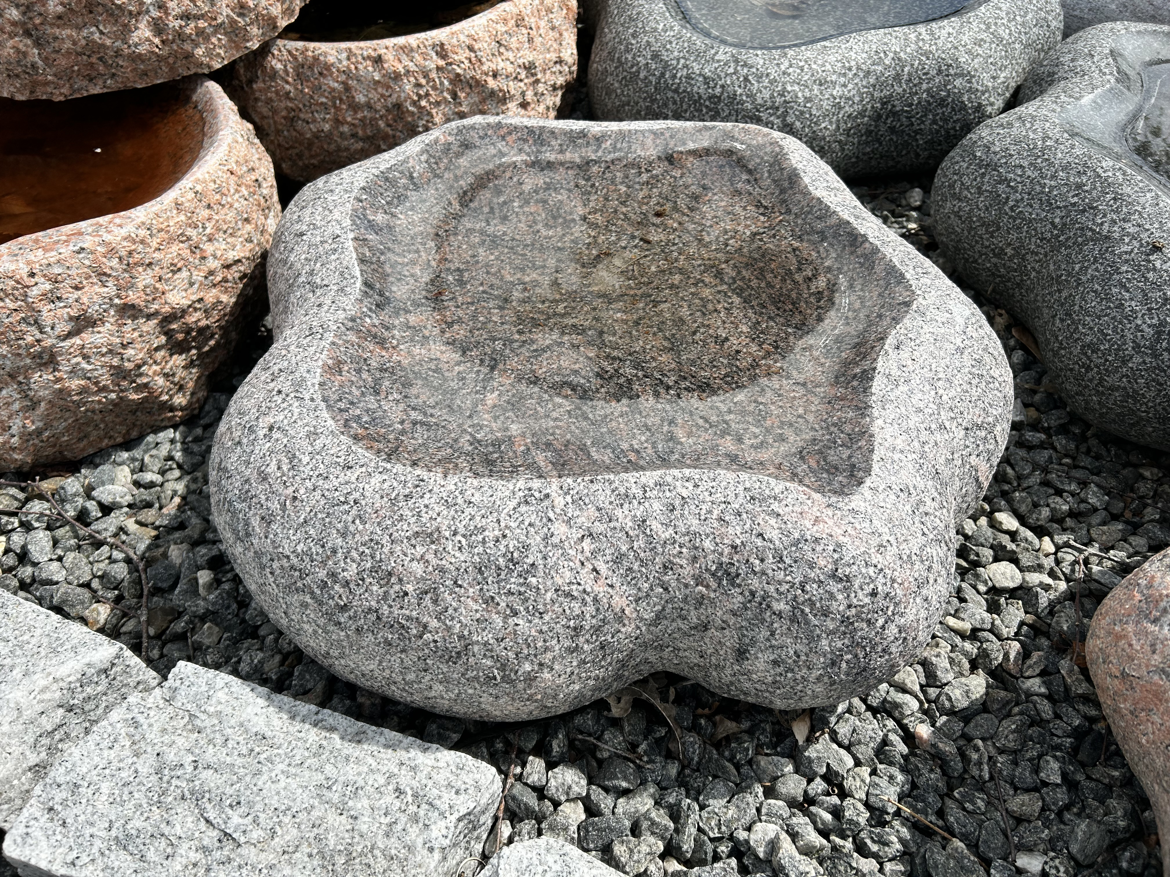 Indisk fuglebad i bølget form. Fuglebadet fås i flere farver - så skriv gerne ønske til farve i kommentarfeltet. Fås i gråsort, rødlig, blålig, lilla eller grålig granit.