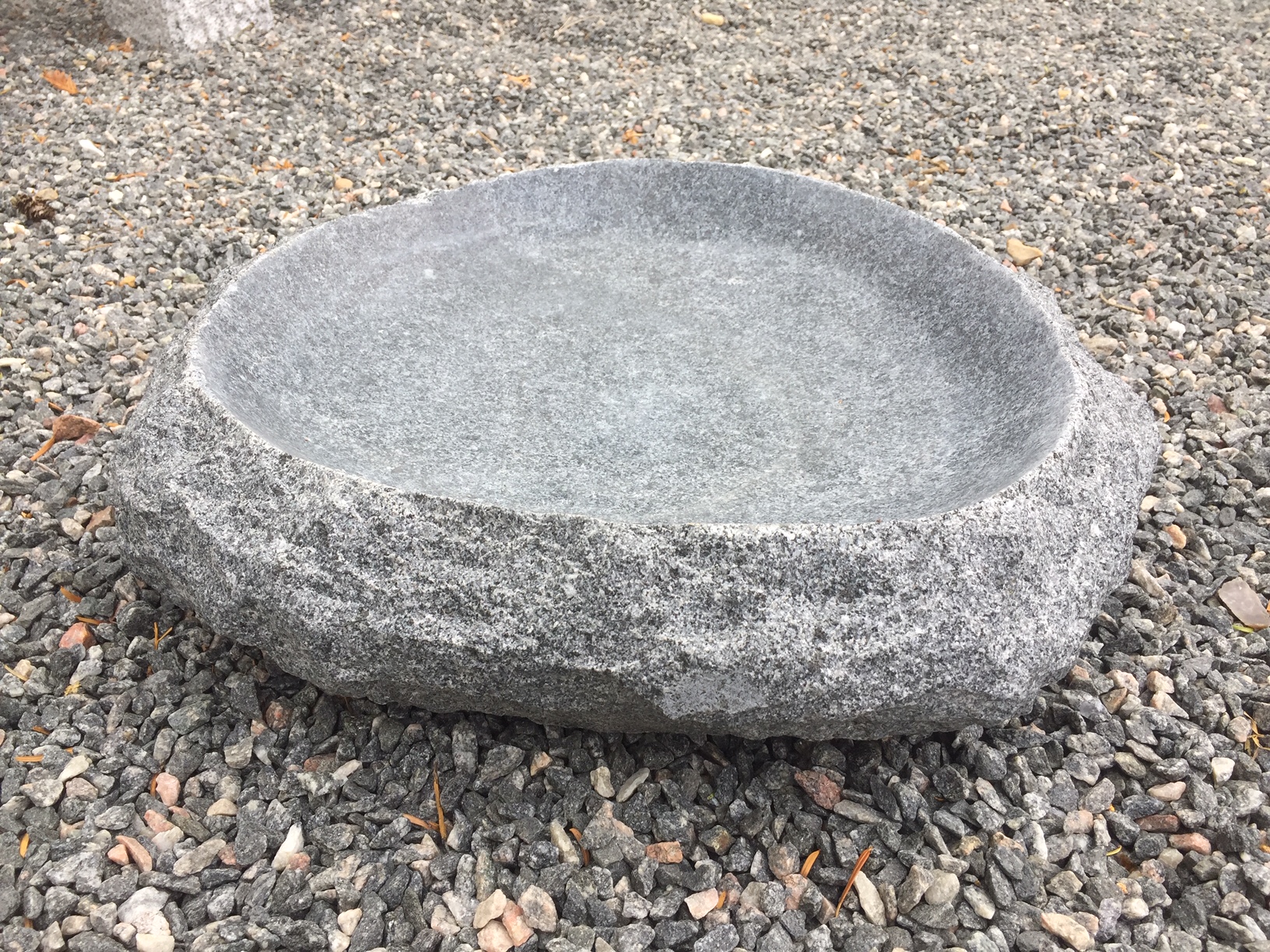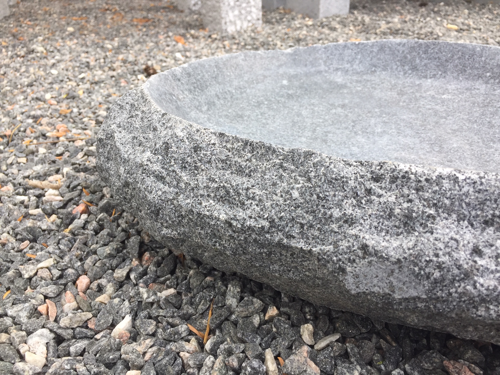 Fuglebad udhugget i gråsort granit med poleret overflade der frembringer granittens varierende farvespil.