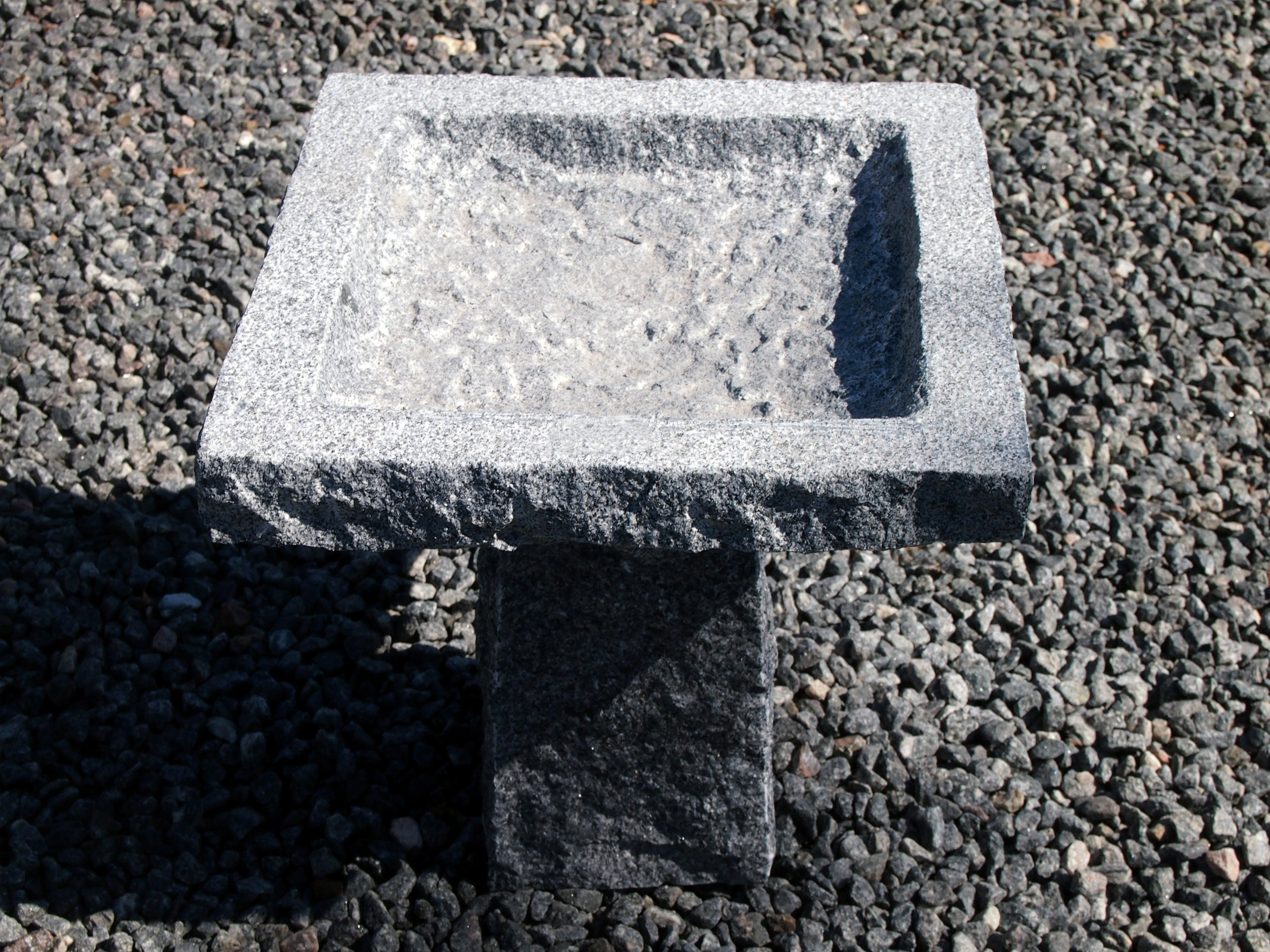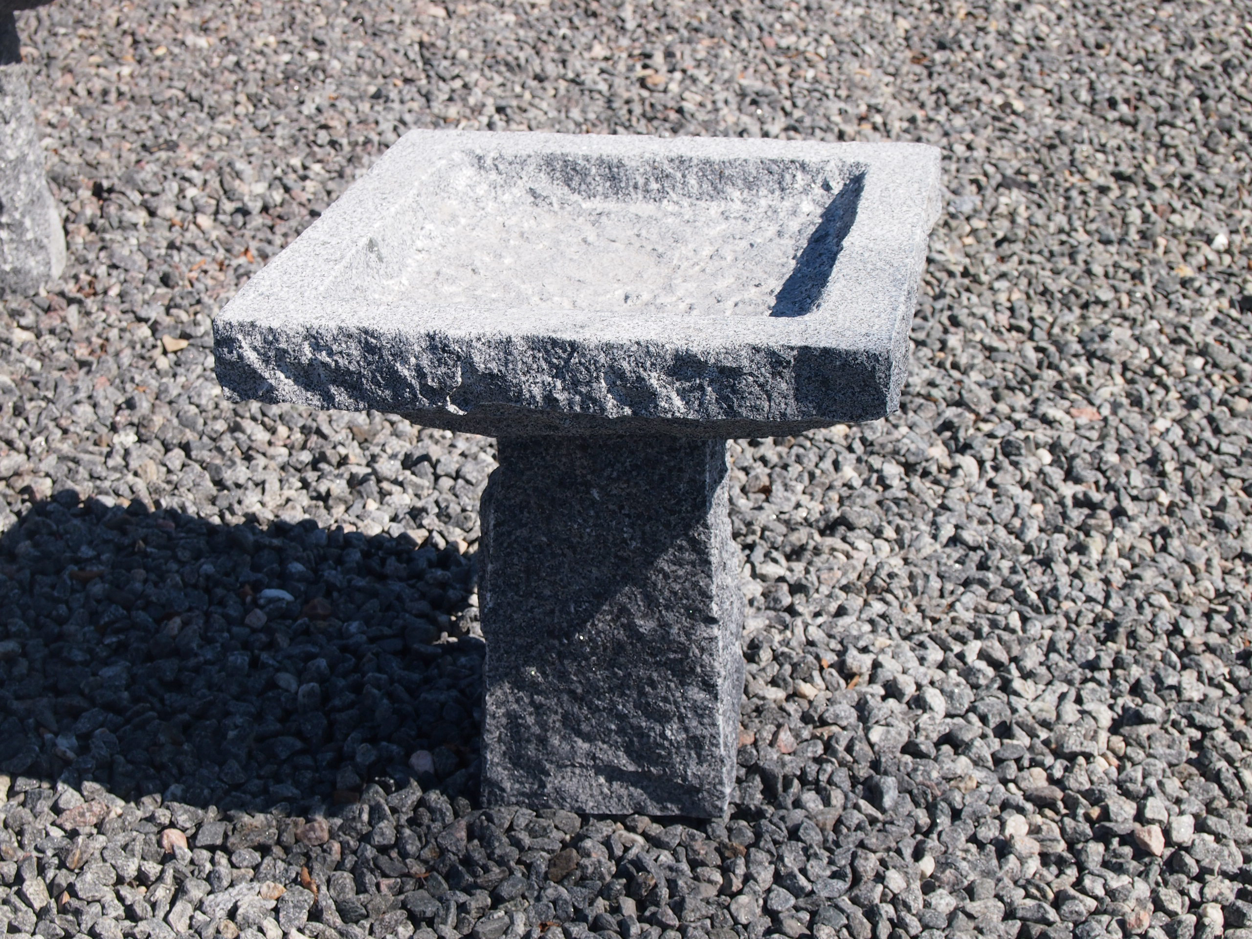 Lille granitfuglebad med 4- kantet skål i gråsort granit med kløvet overflade.