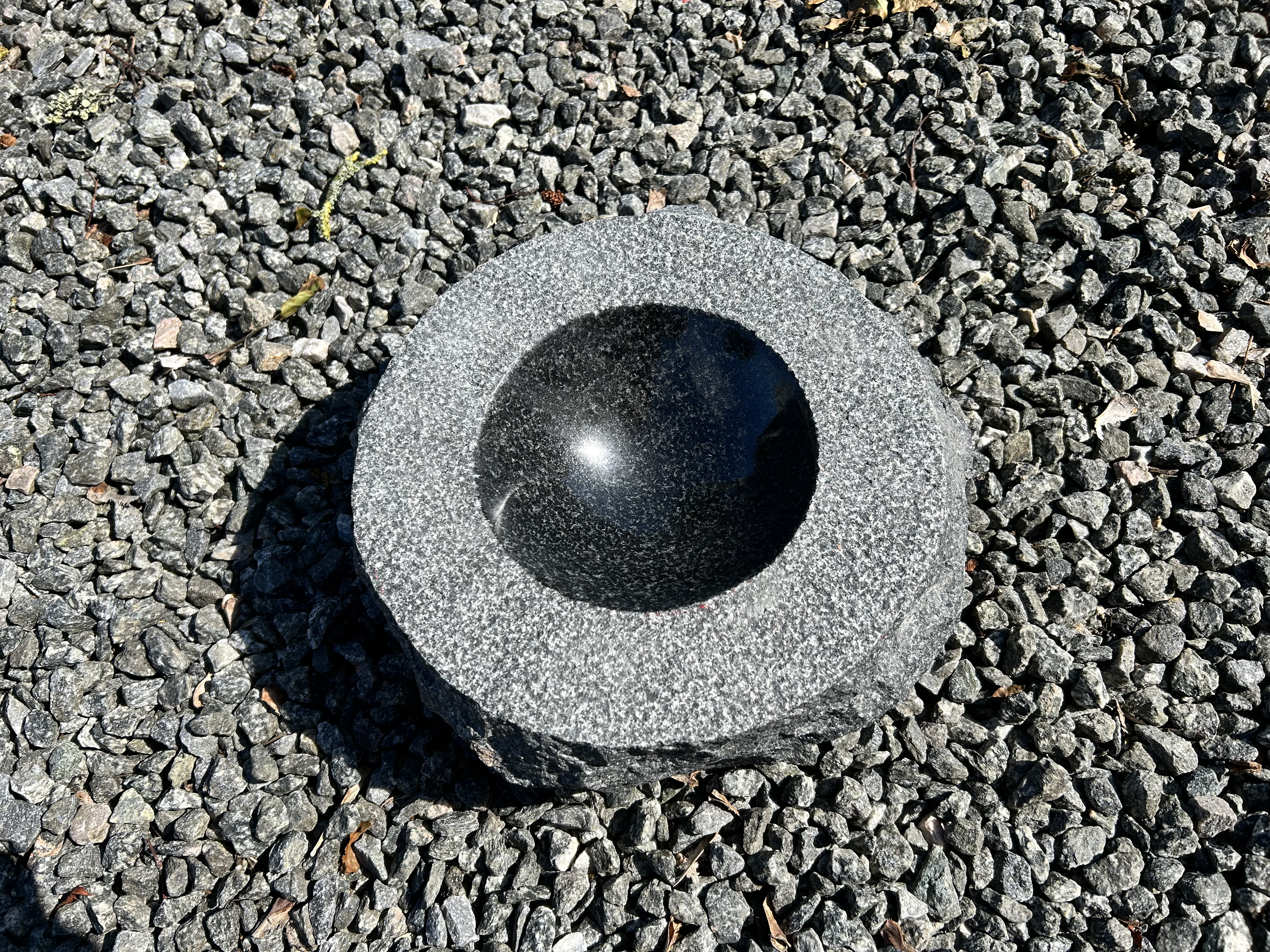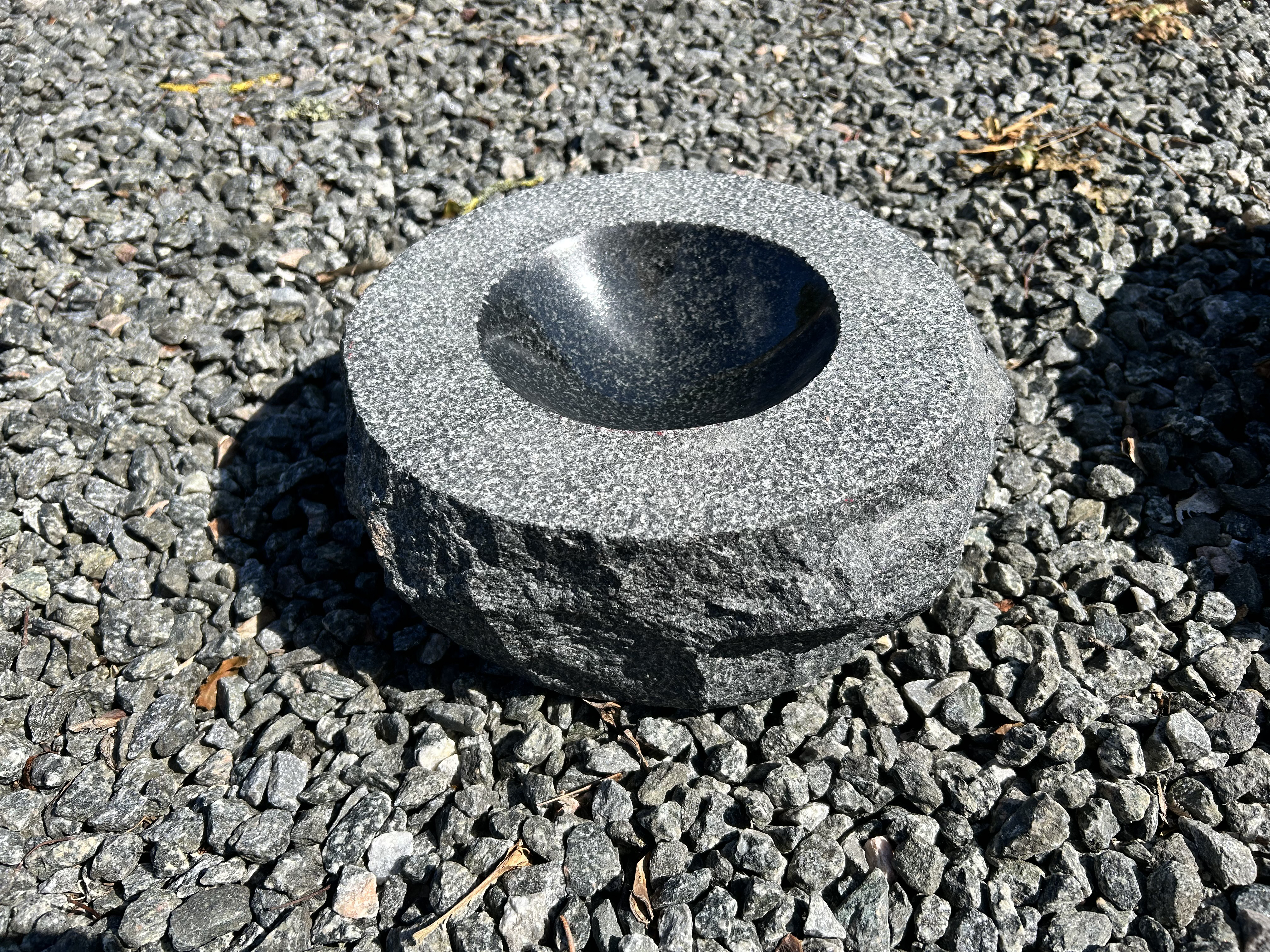 Fuglebad i sort granit med poleret skål, stokhugget top og kløvet ydre.