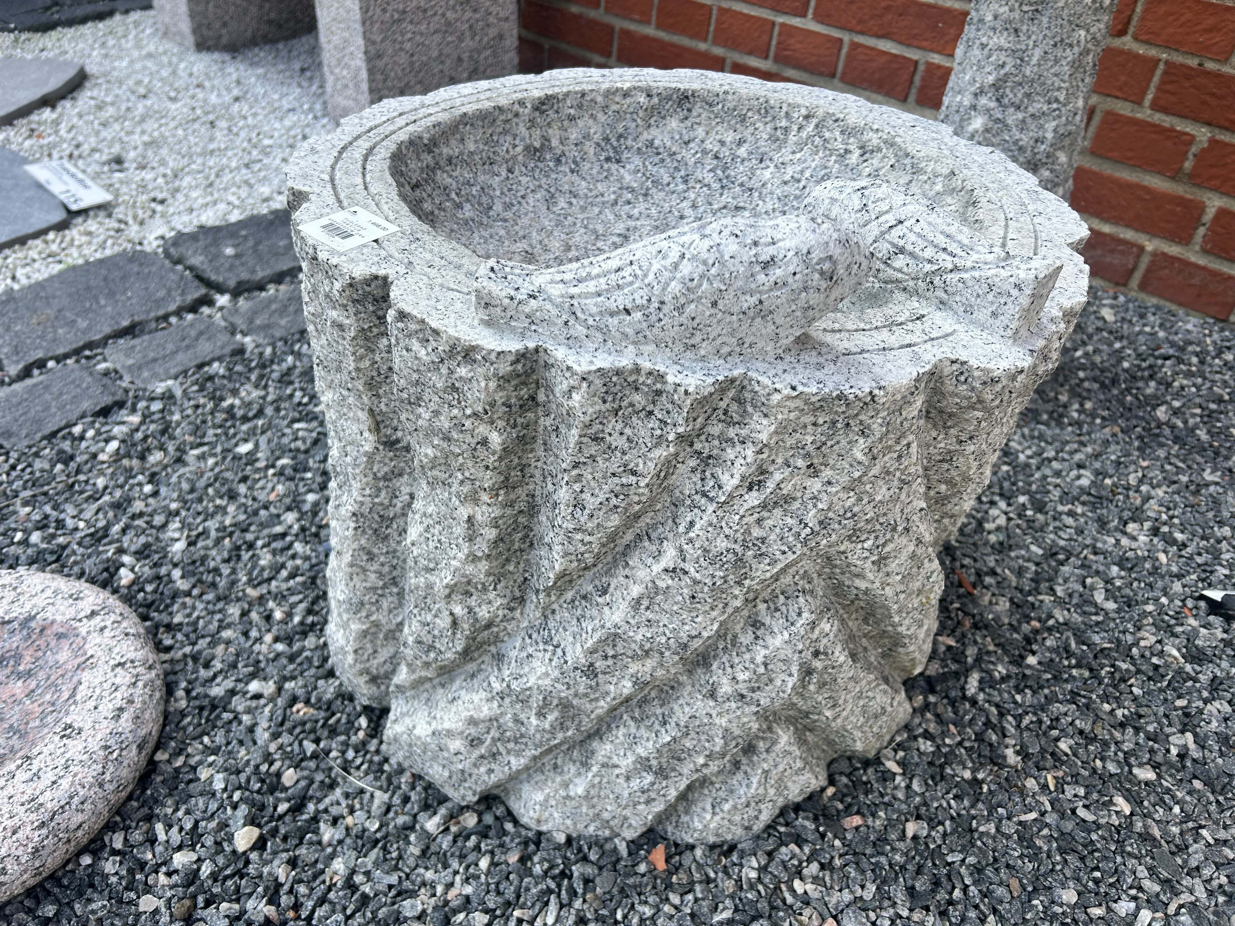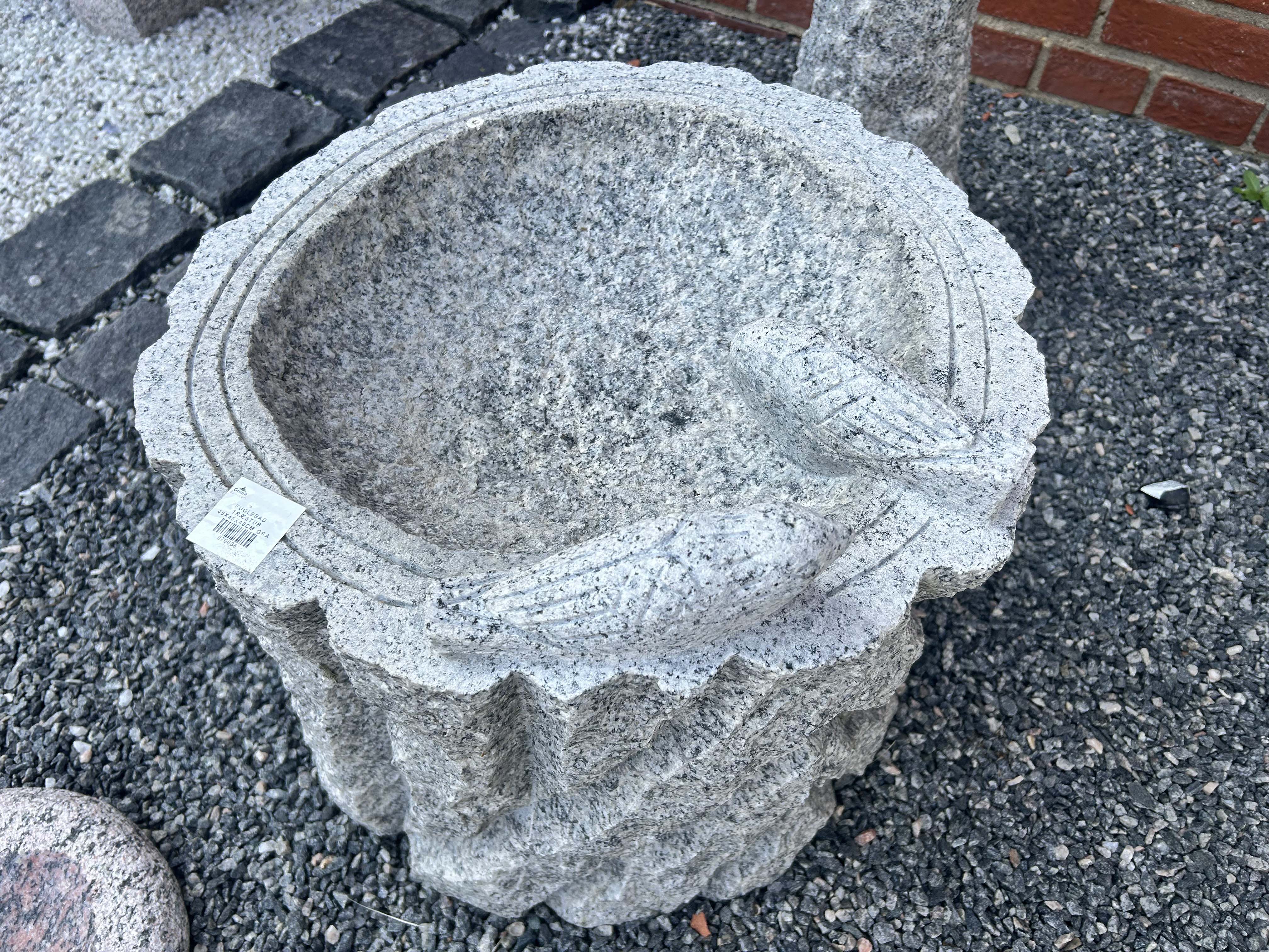 Fuglebad udhugget som træstub i lys grå granit med fugle. Fuglebadet er massiv.