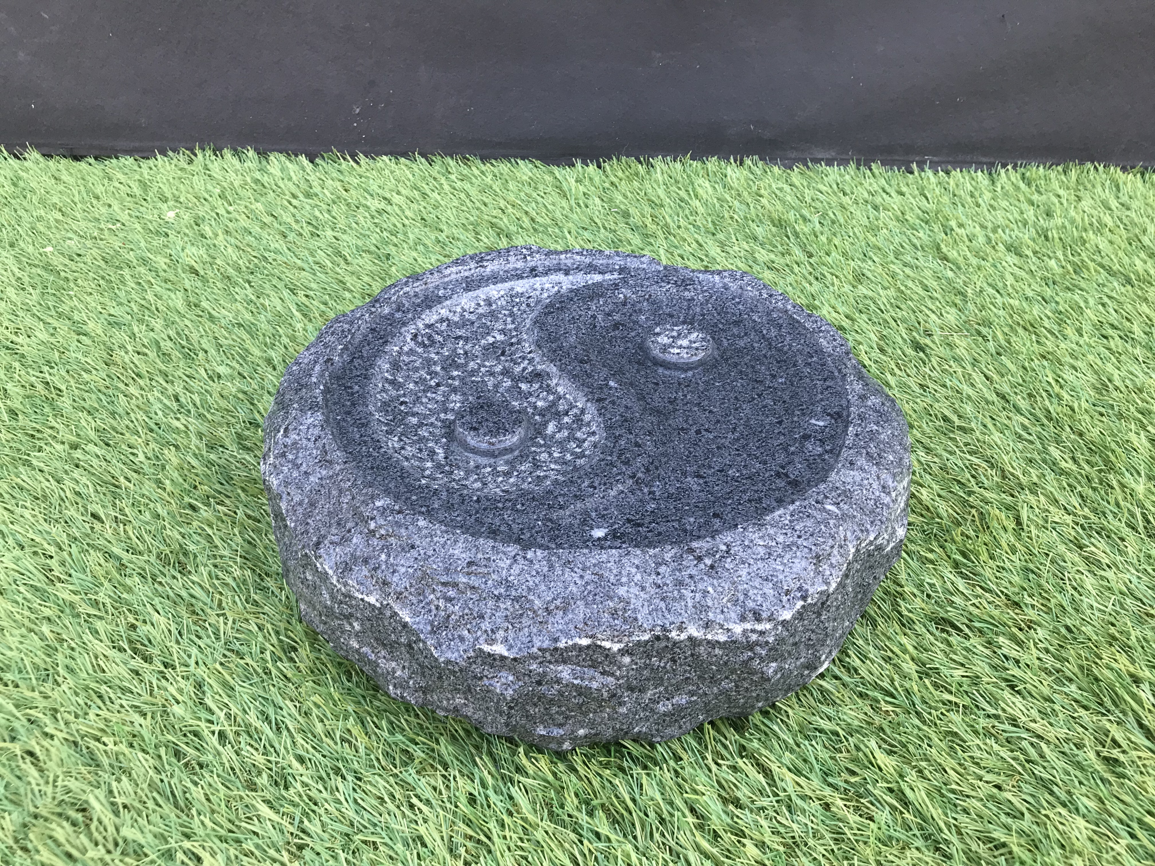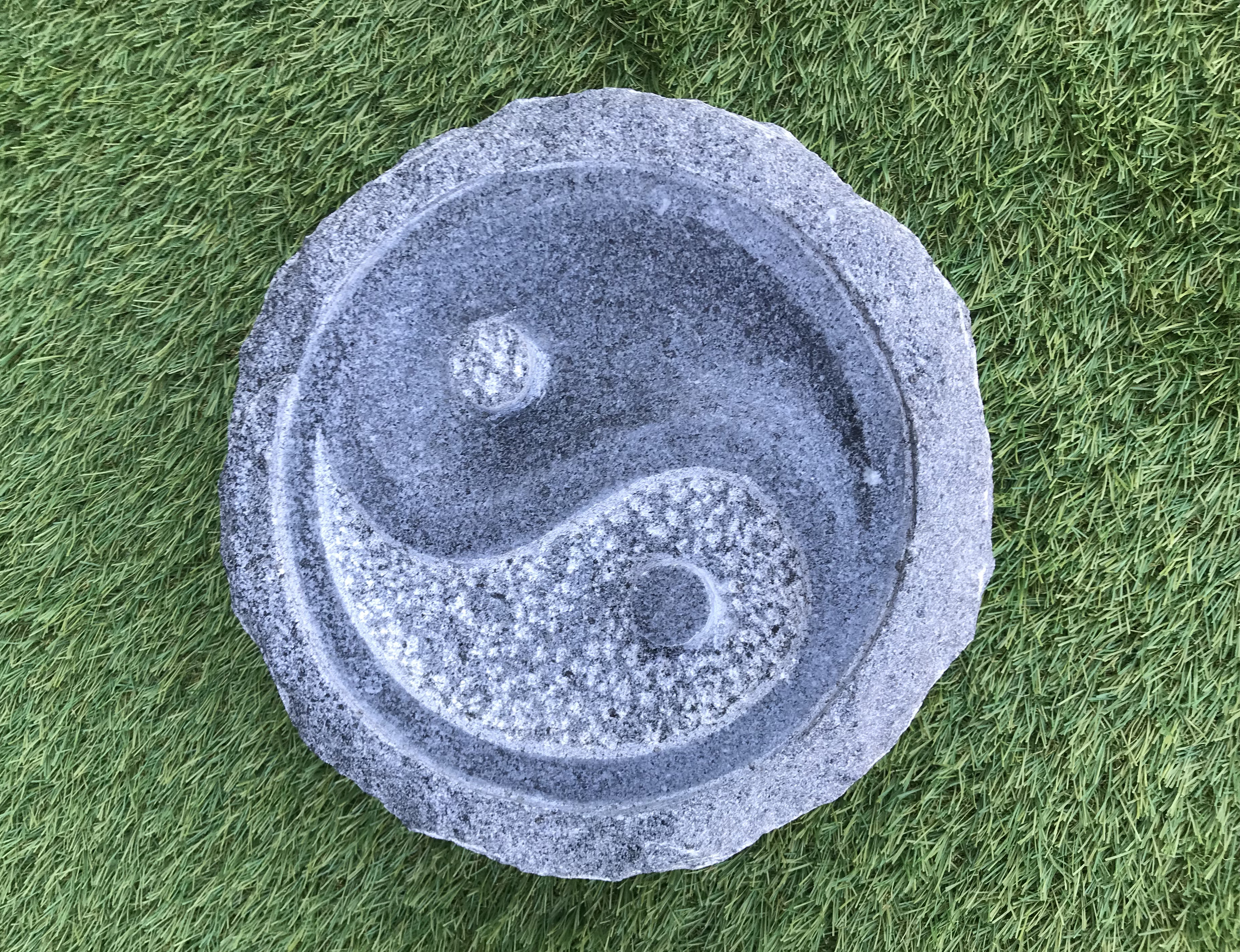 Fuglebad i gråsort granit med groft hugget sider, og med både poleret og stokhugget skål der skaber en kontrast i stenen og giver et unikt Yin og Yang symbol.