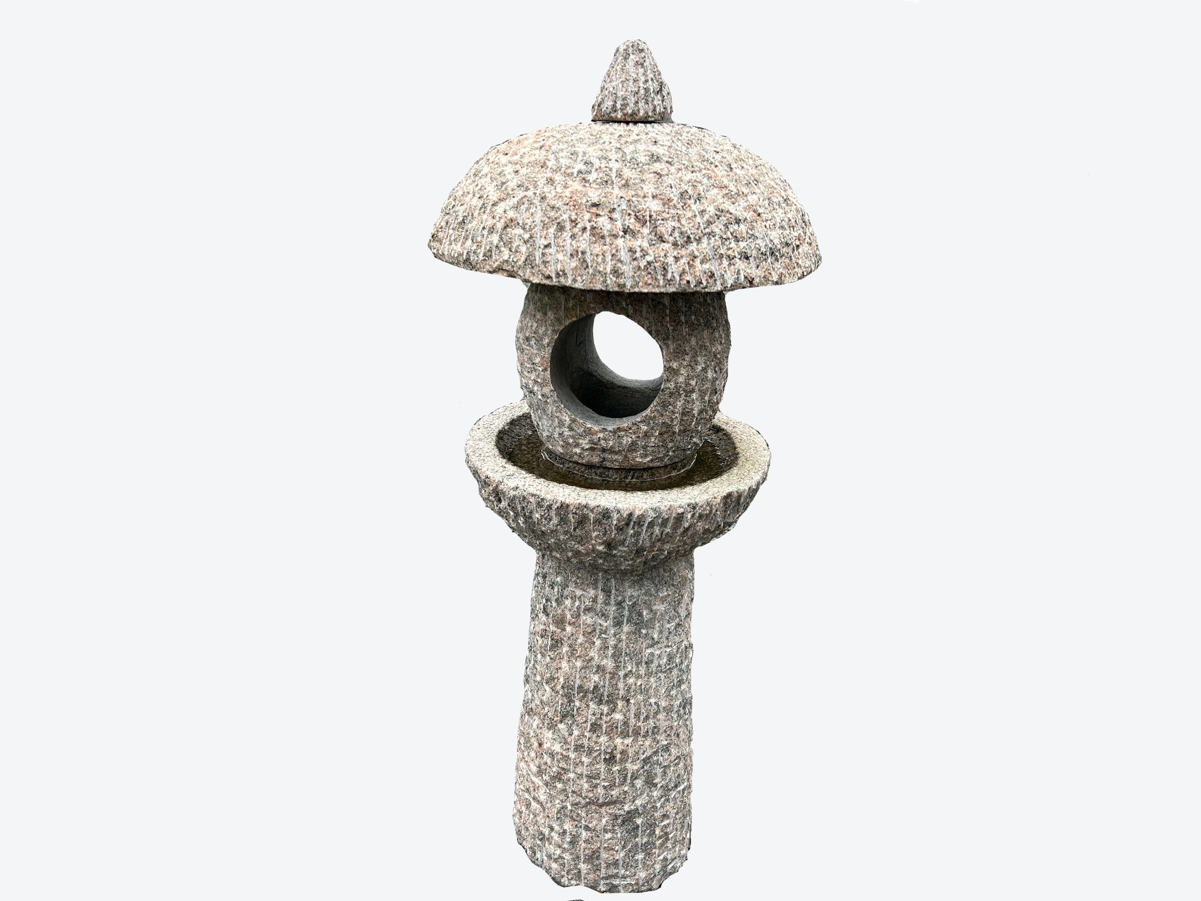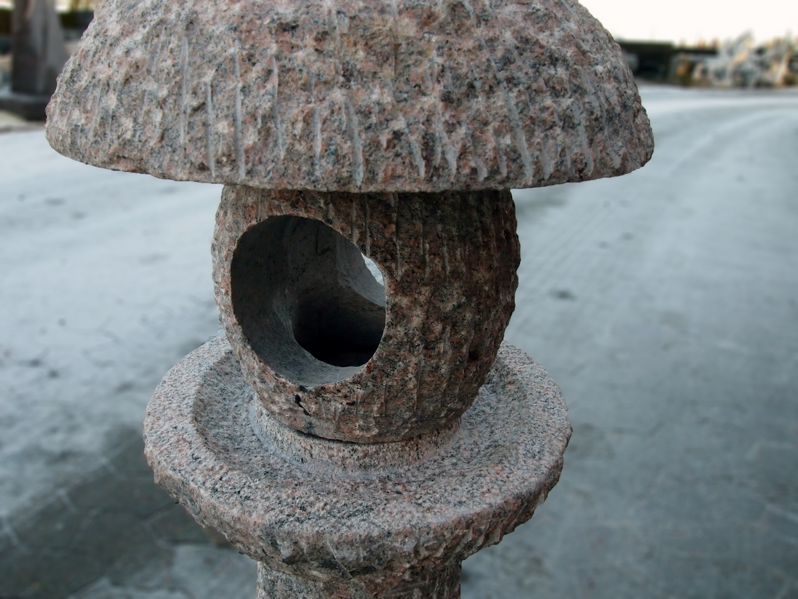 Fuglefoderhus i rødlig granit. Fuglefoderhuset kommer i 5 dele, så den er nem at samle på stedet.