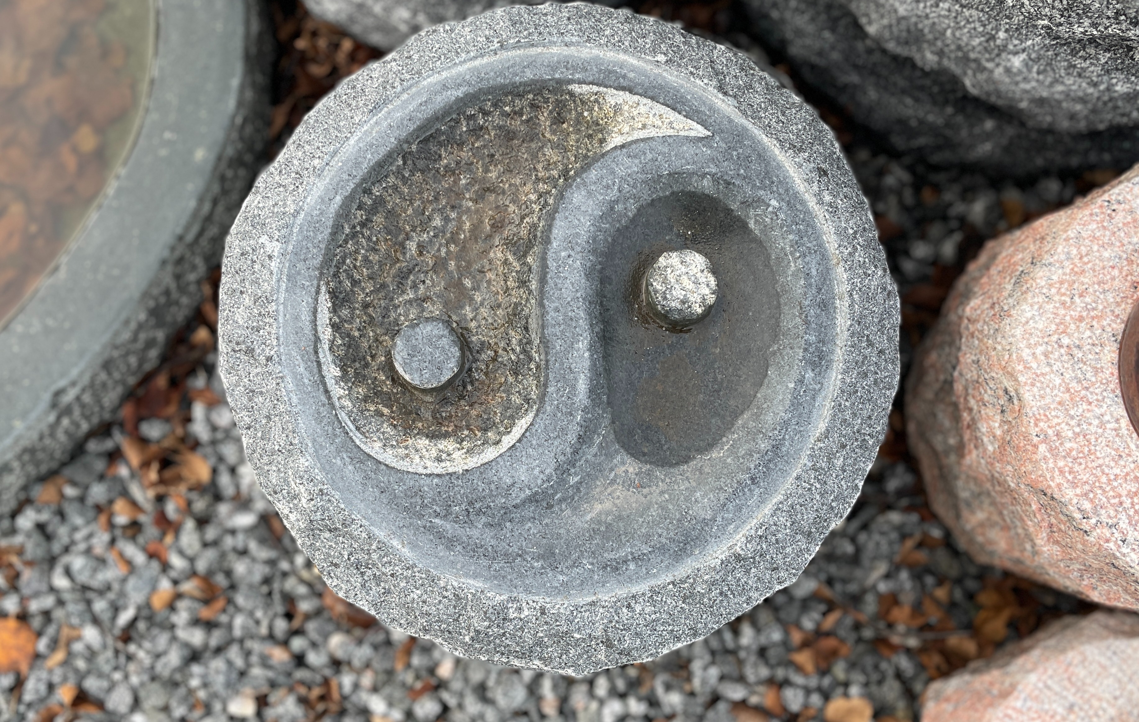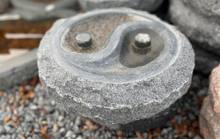 Fuglebad i gråsort granit med poleret motiv af yin og yang. Fuglebadet har kløvede sider og et poleret/slebet motiv. Obs. fuglebadet er vådt på billederne