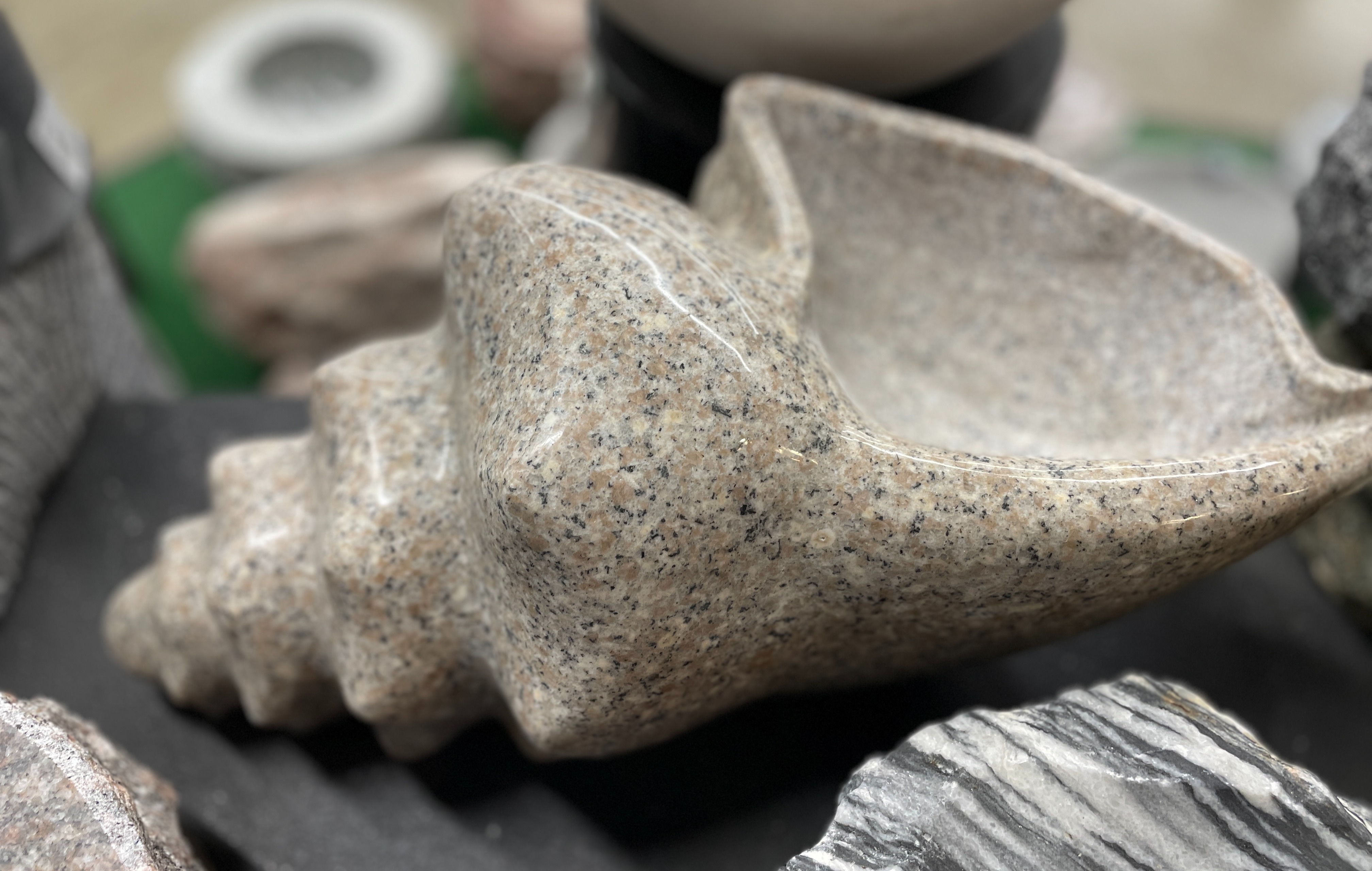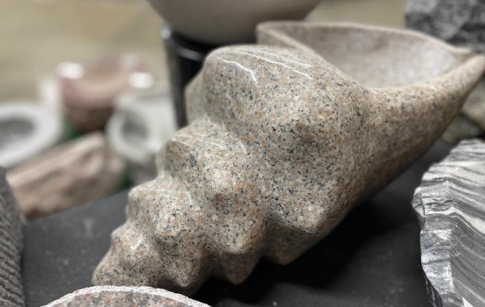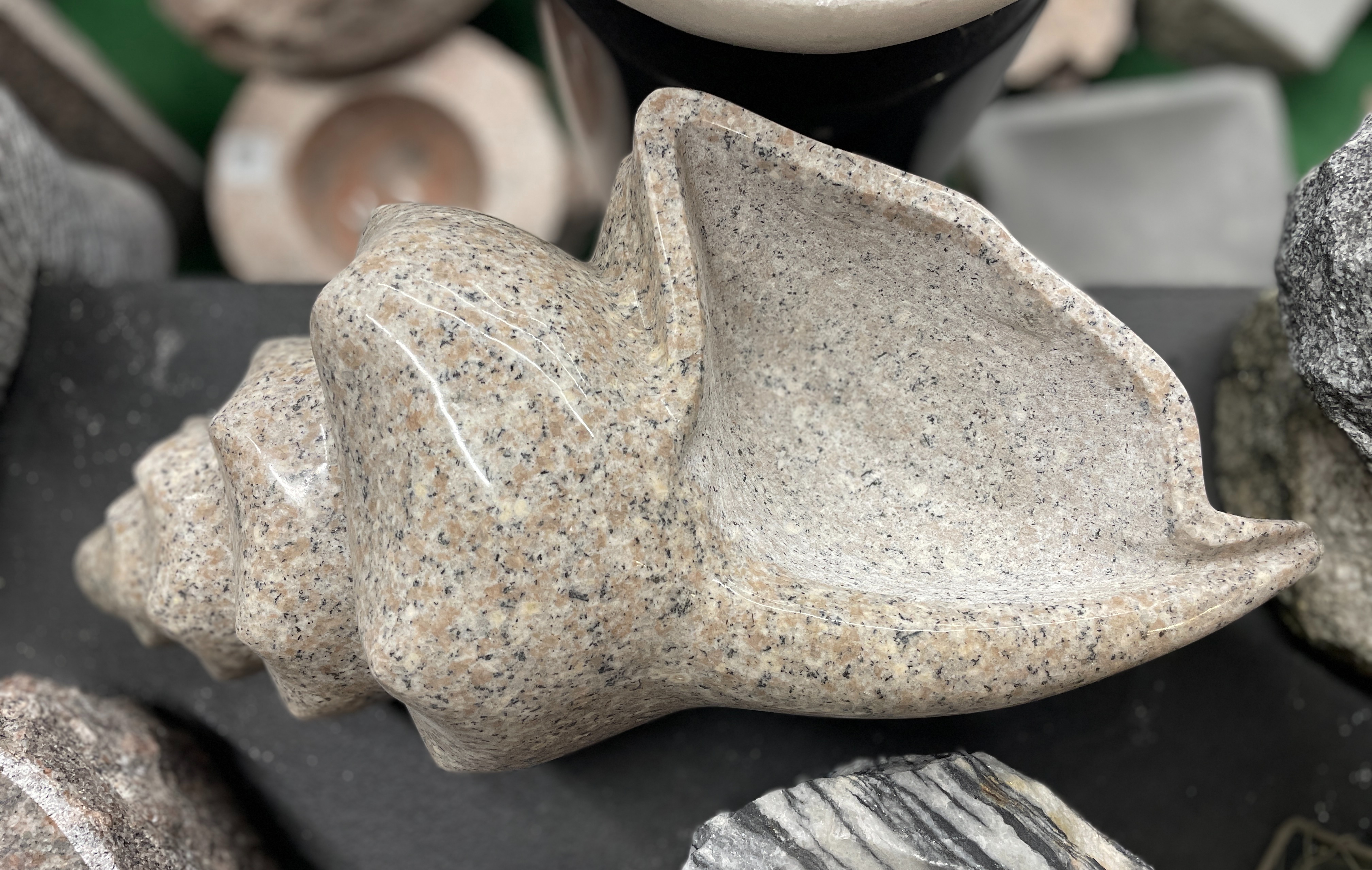 Fuglebadet forestiller en åben konkylie med poleret yderside og rå/slebet skål. Den polerede overflade frembringer granittens flotte og varierende farvespil.