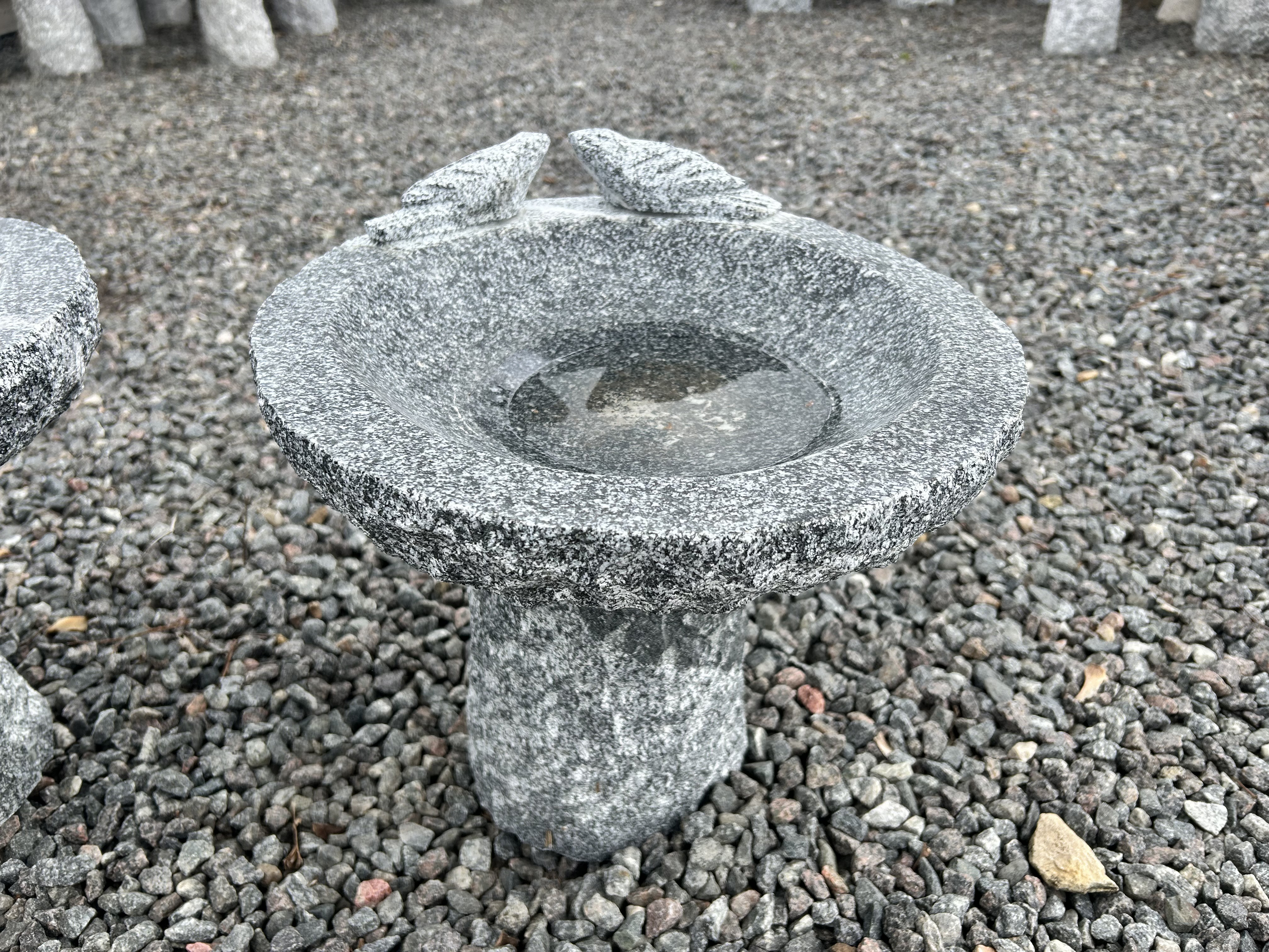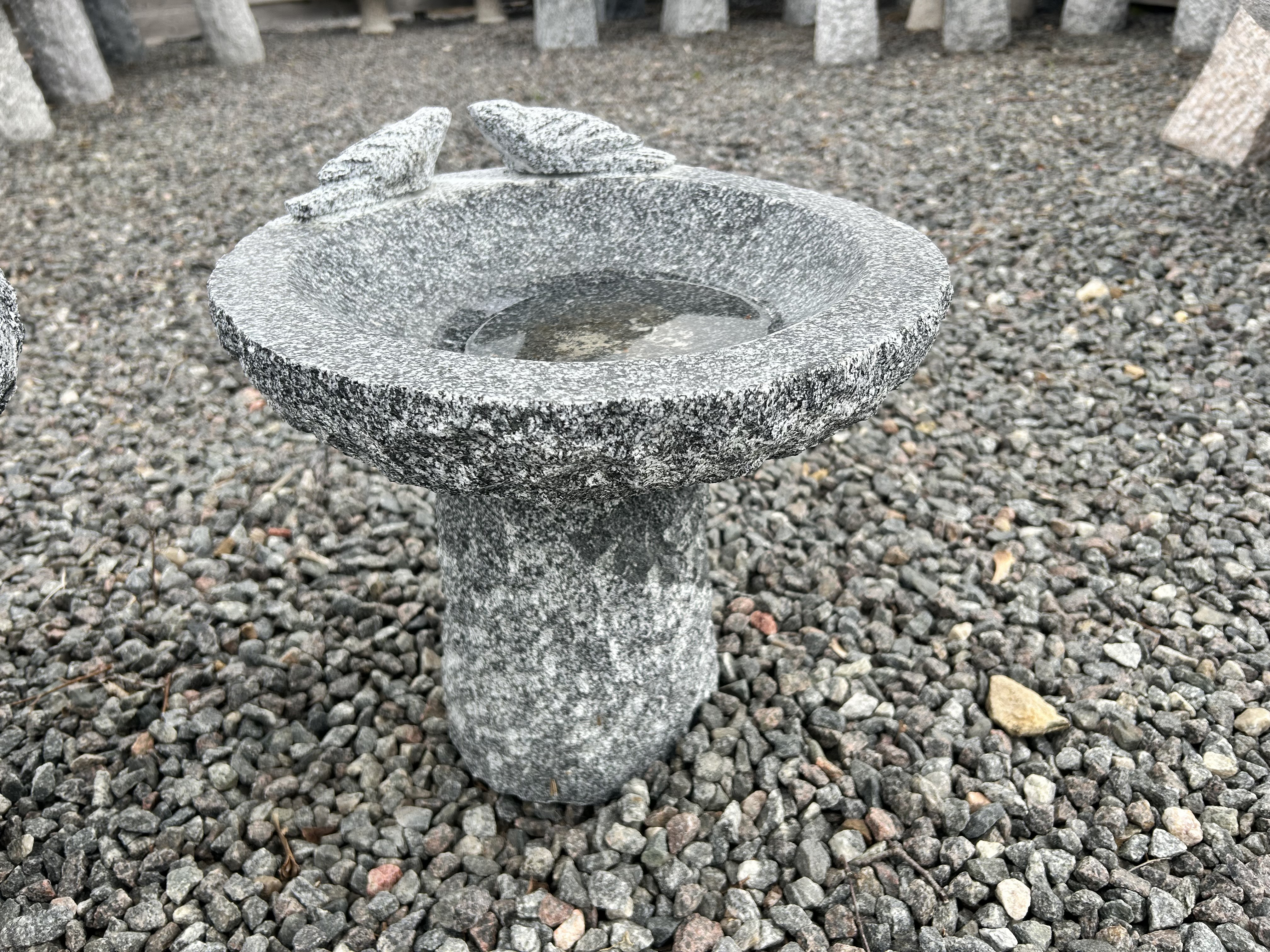 Fuglebadet har et rustikt ydre, som giver en spændende kontrast til den polerede skål. To fugle på skålen skaber en hyggelig detalje og virker indbydende så andre fugle tager plads.