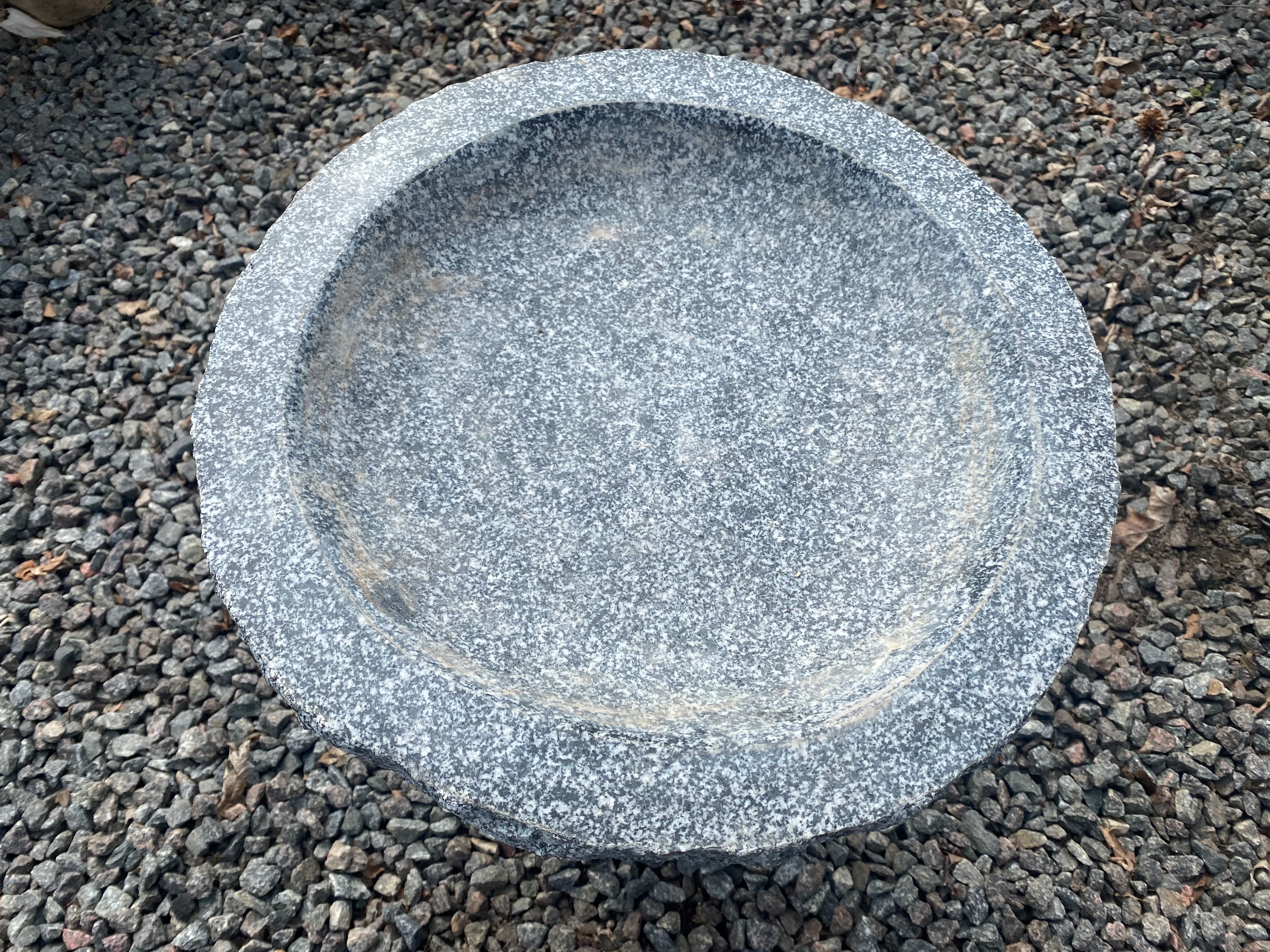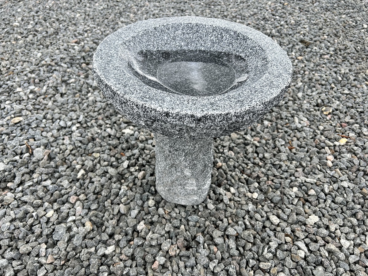 Fuglebadet har en rustik og kløvet overflade som står i god kontrast til den polerede skål, der frembringer granittens farvespil.