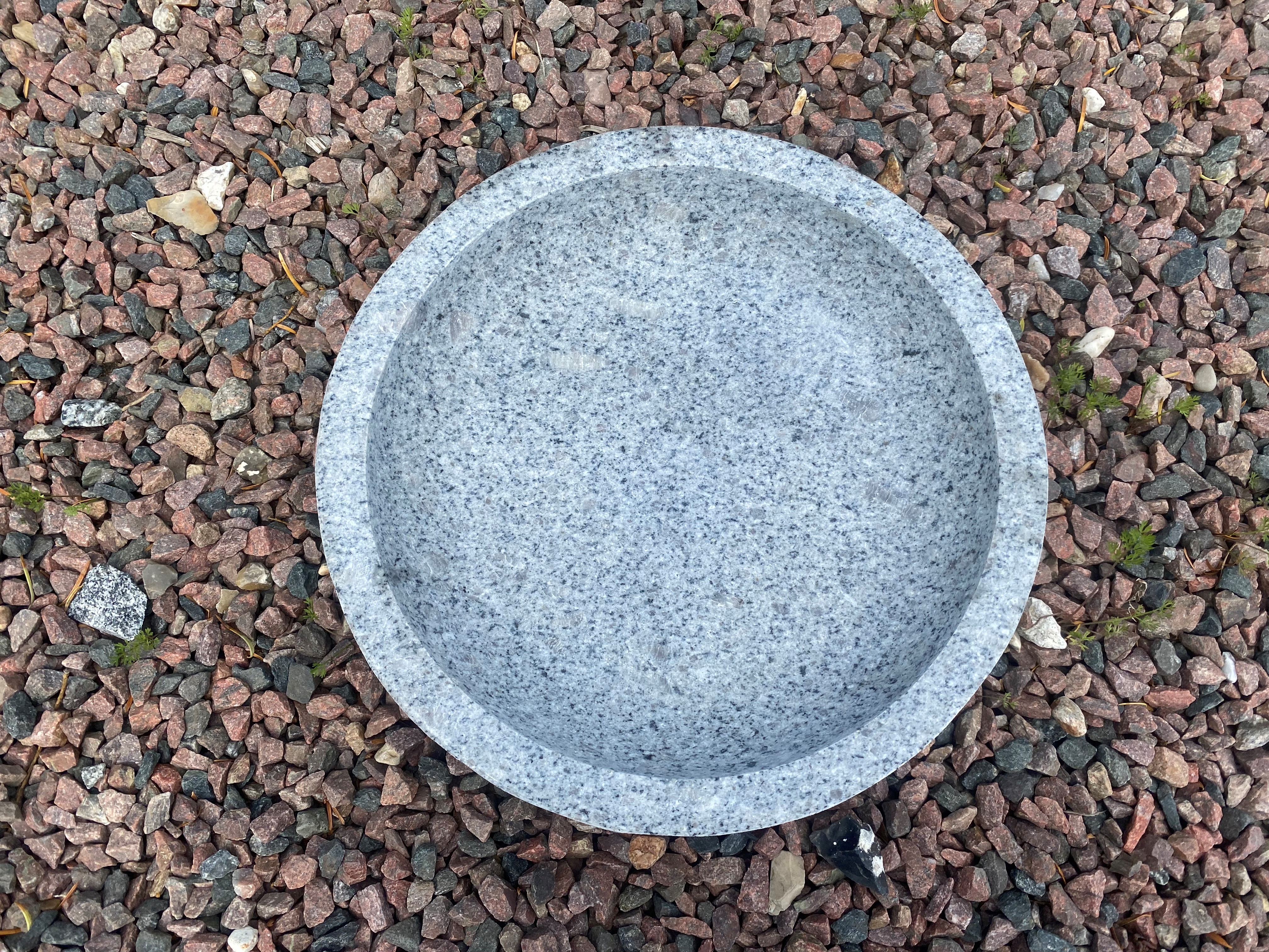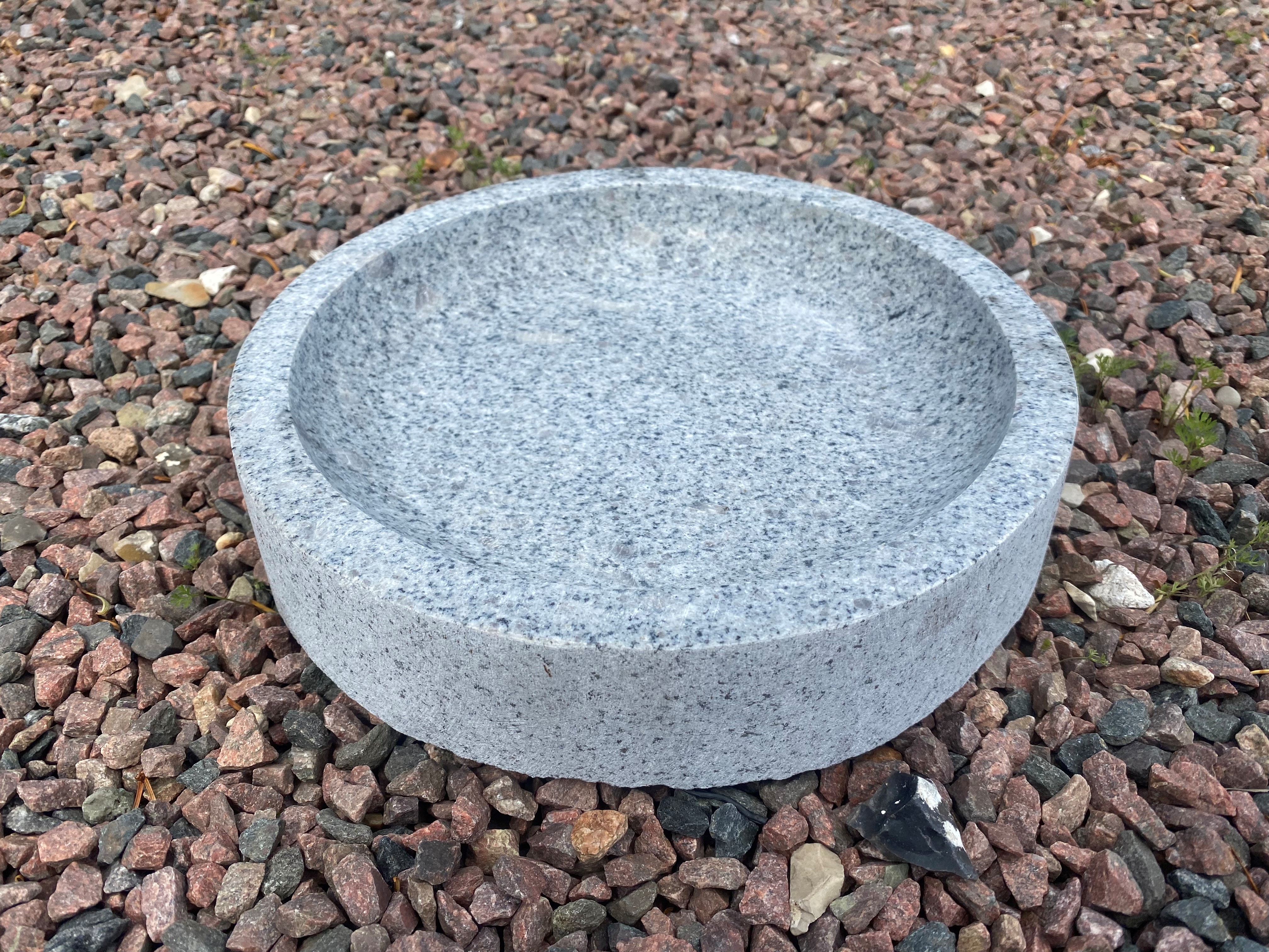 Fuglebadet har poleret skål og savede sider - velegnet til et lille sted i haven eller ved kirkegården.