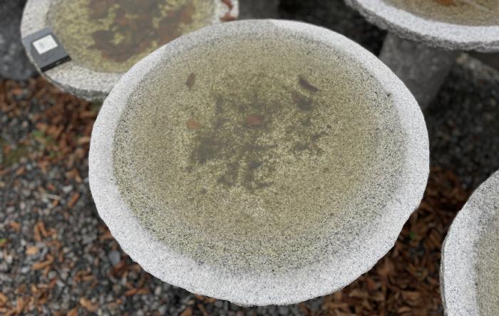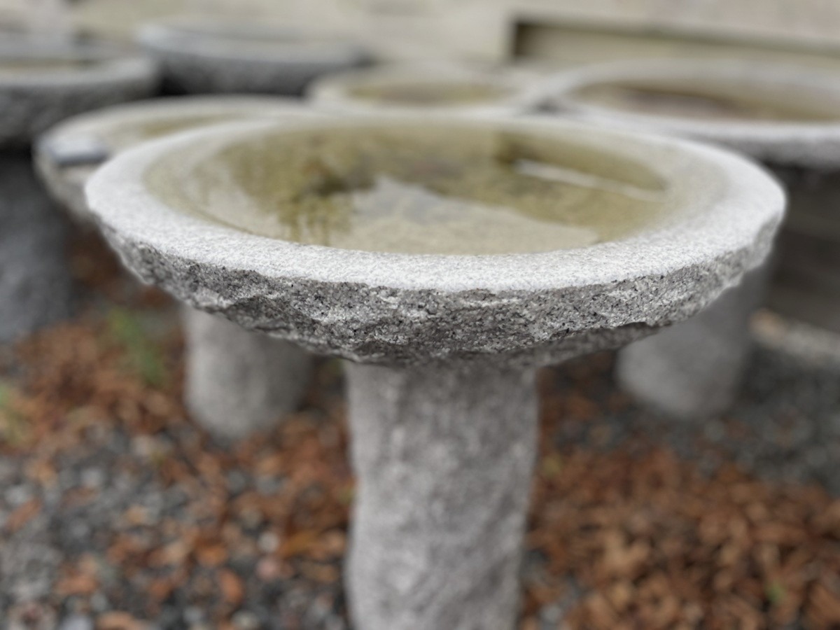 Stort rundt fuglebad på sokkel.