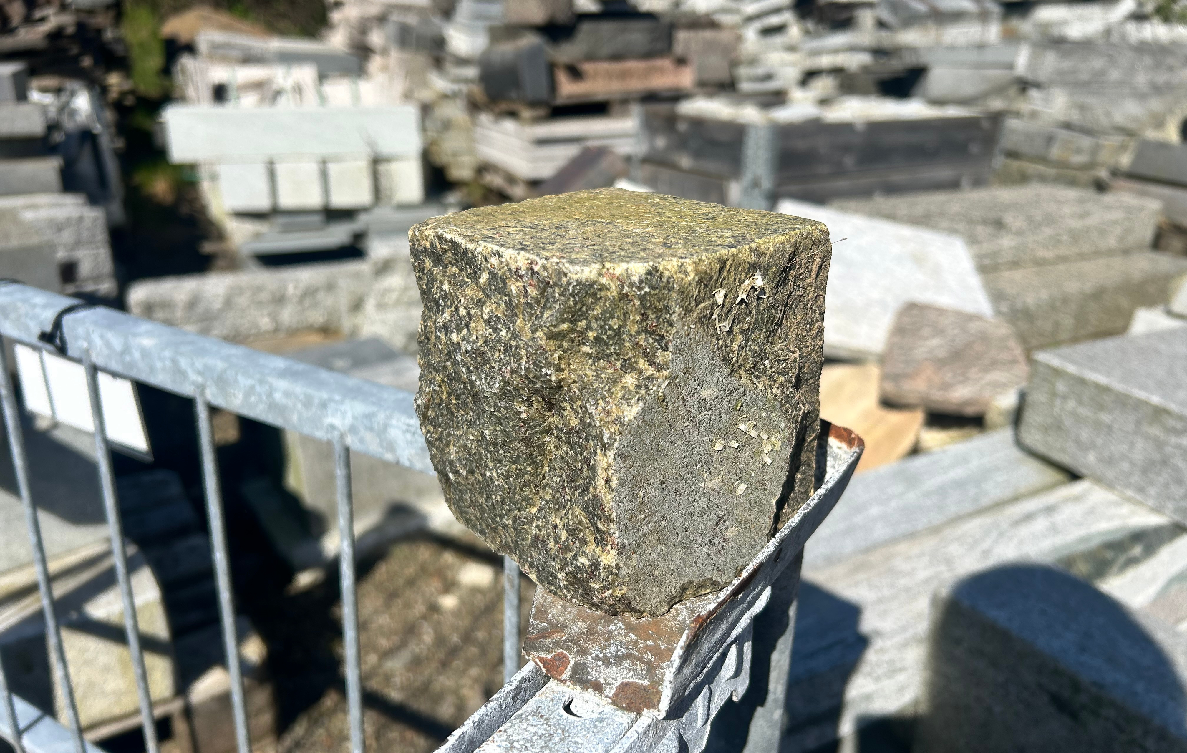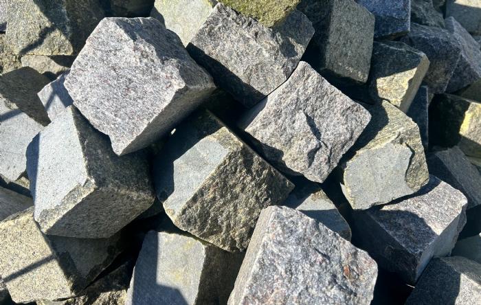 Chaussésten i blå indisk granit med kløvede og savede sider