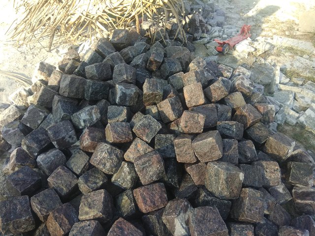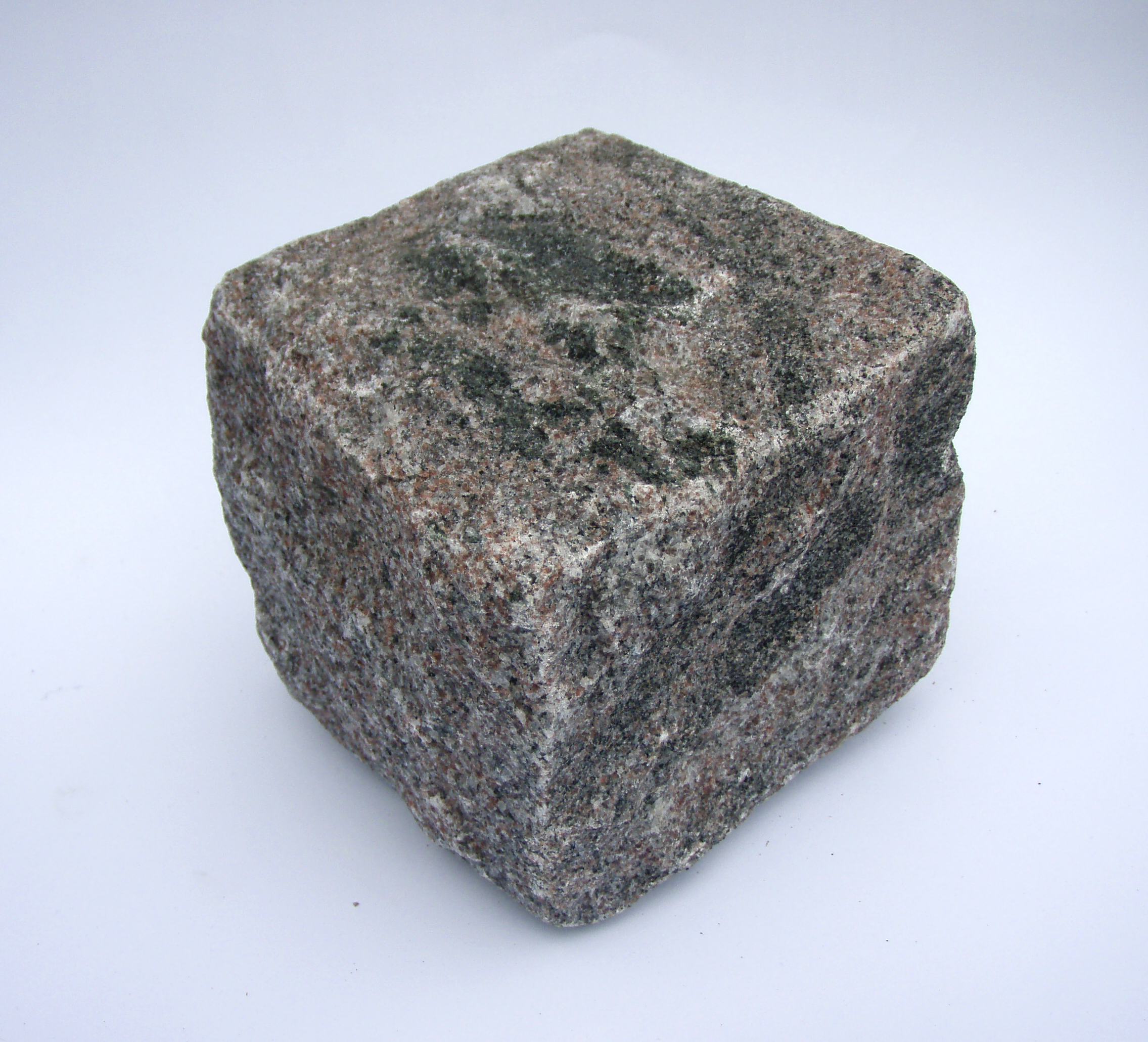 Chaussésten håndhugget i indisk Paradiso granit. Pakket i kasse med cirka 380-440 chaussesten. Natursten med flot farvevariation og naturlige årer i mørke, grålige og lilla nuancer