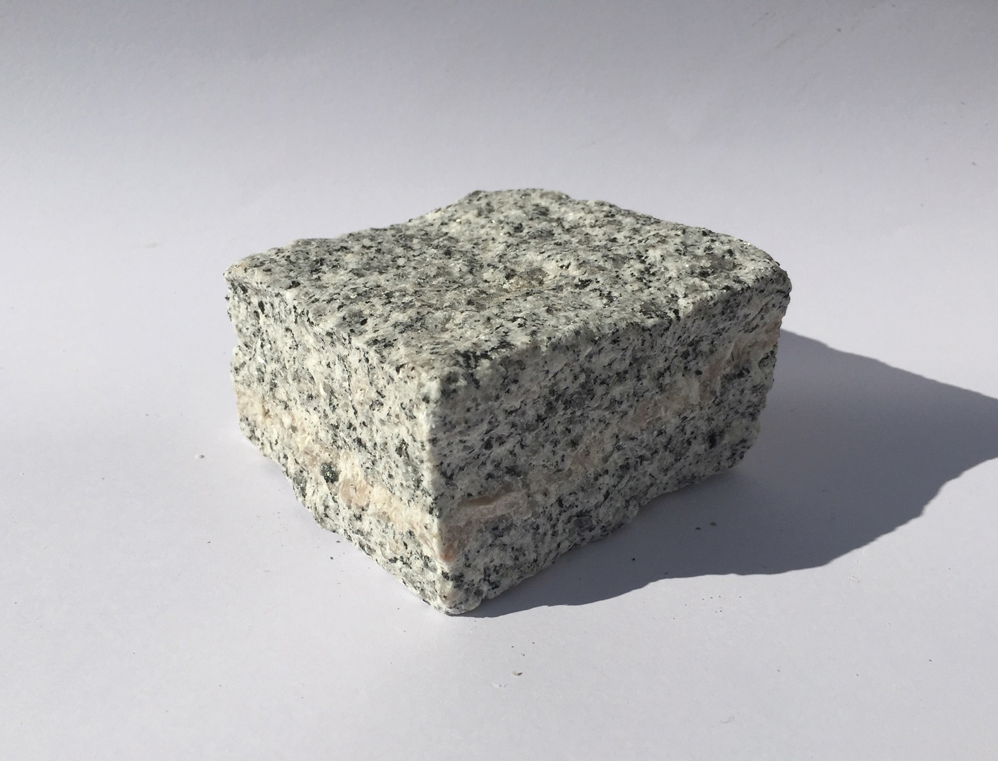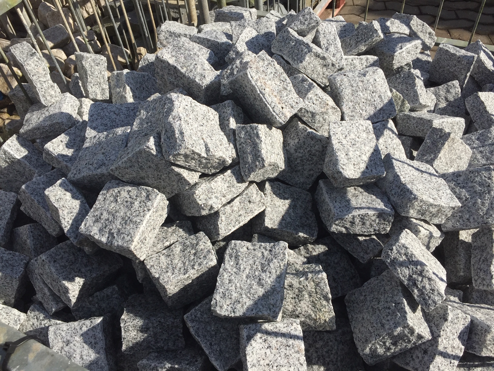 Lille chaussésten i lys grå granit. Kaldes også halve chaussésten eller flækkere.