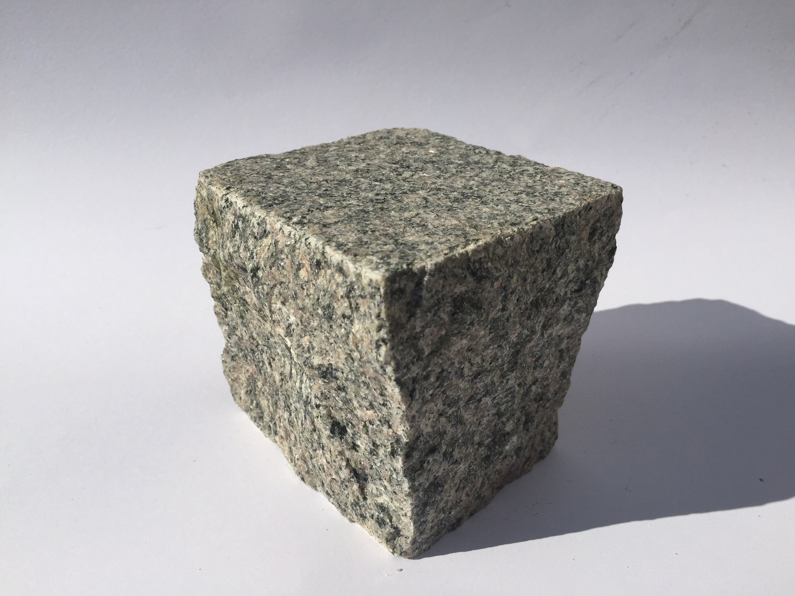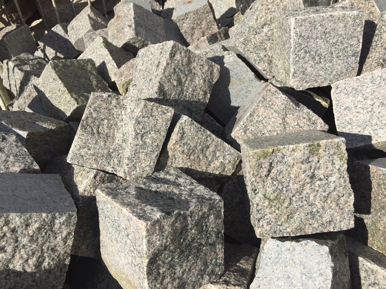 Jævn granit chaussésten i let rødlig granit. Toppen er jetbrændt og dermed stadig skridsikker men jævn