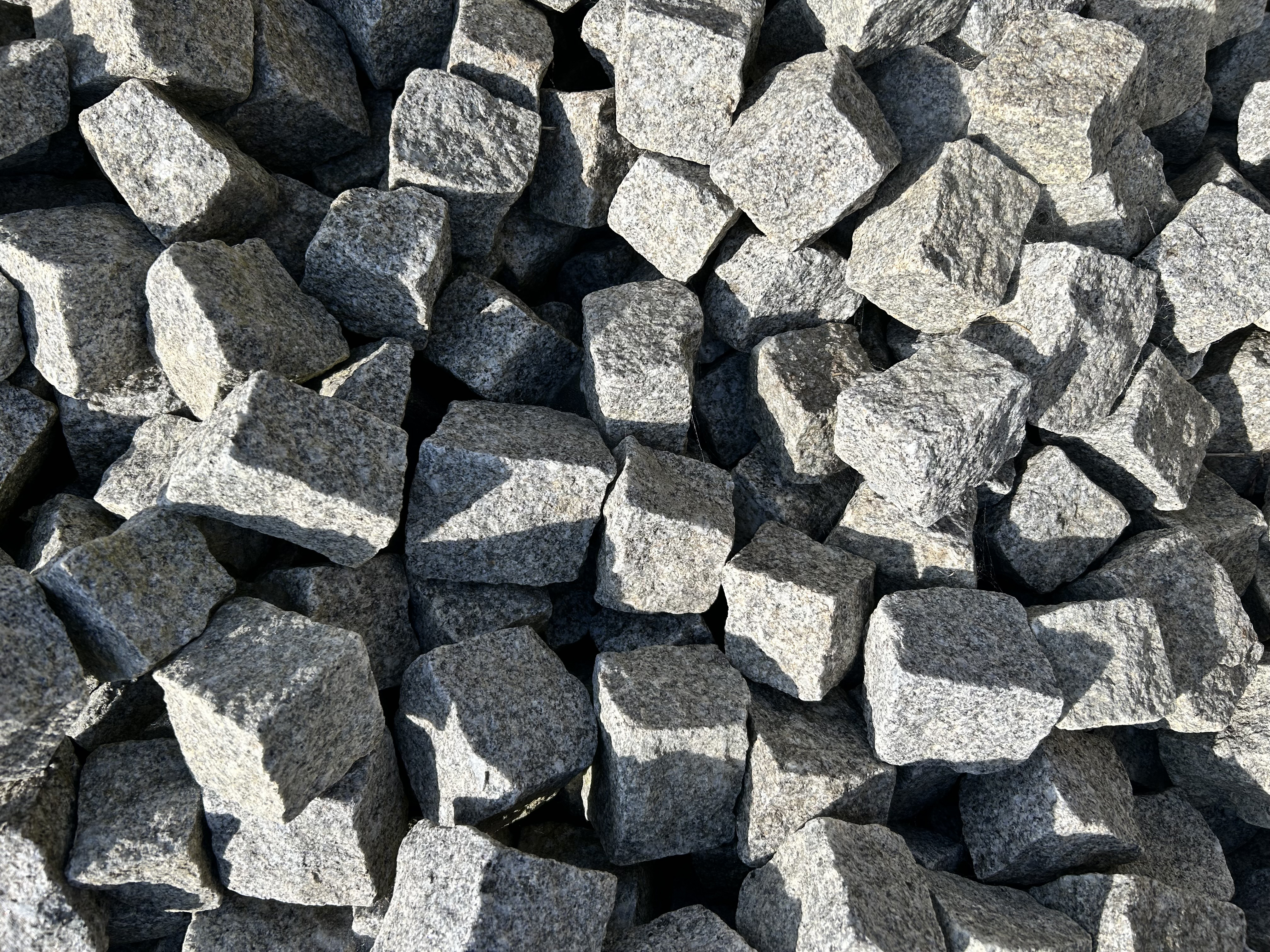 Små mosaiksten i lys grå granit.