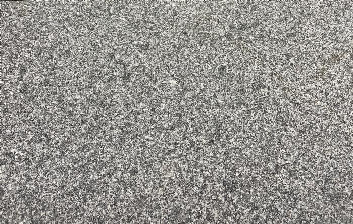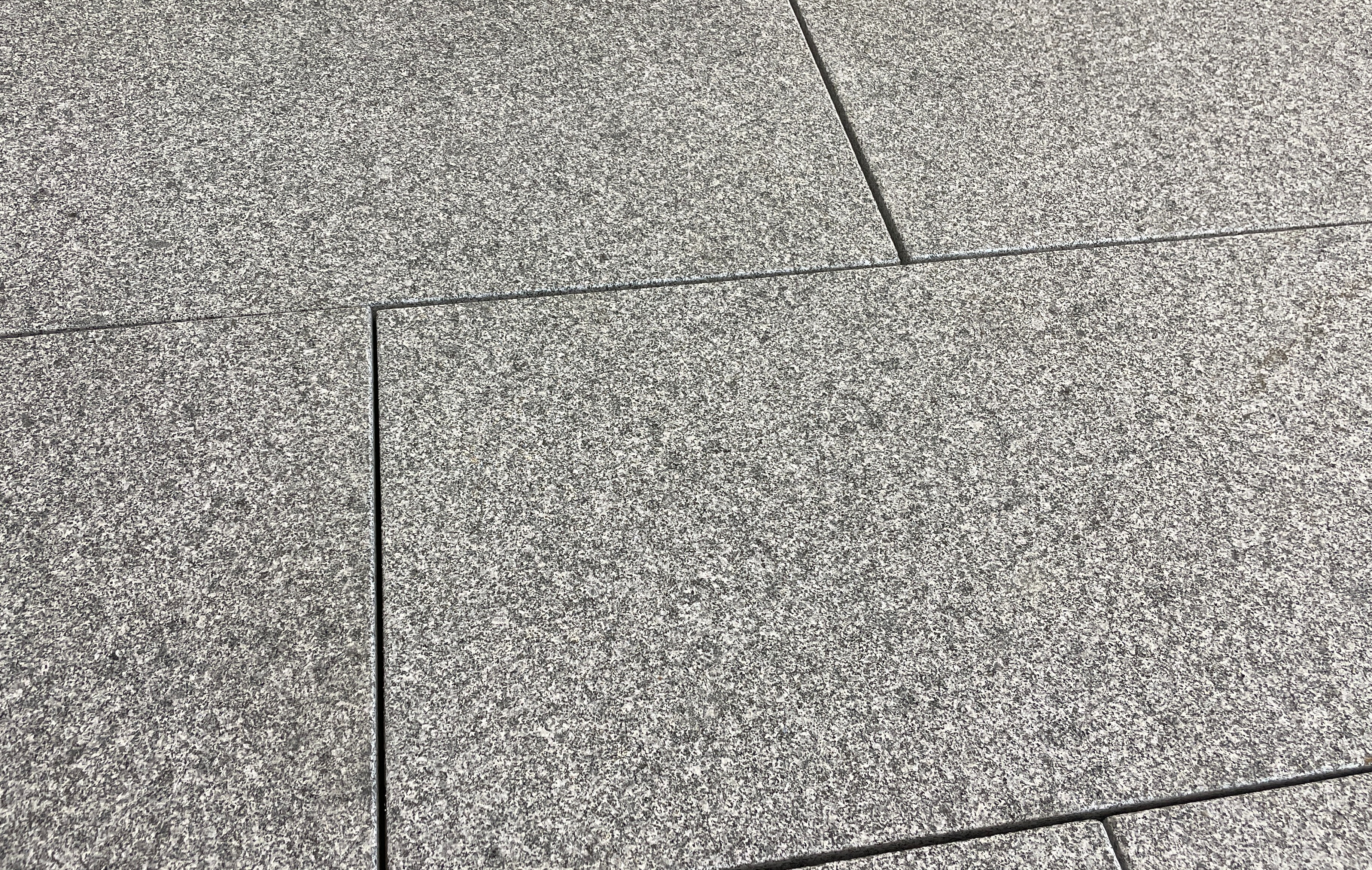 Granitfliser i gråsort granit med skridsikker, jetbrændt/flammet overflade.