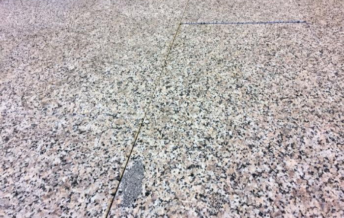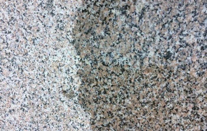 Granitfliser i lys granit med let rosa skær. Fliserne har skridsikker, jetbrændt overflade. Til udendørs brug som terrasseblægning eller fliser i indkørsel.