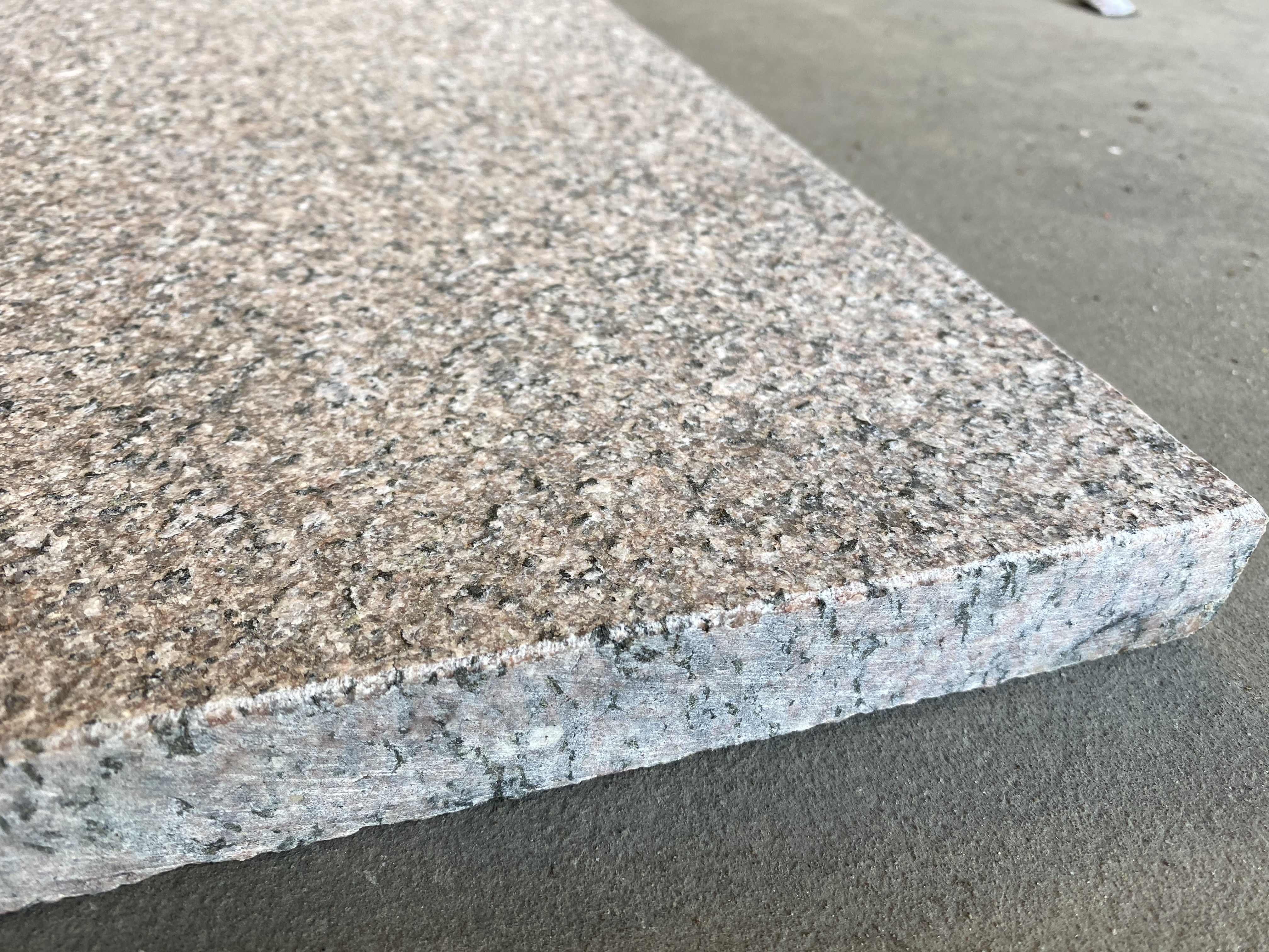 Granitflise i rød granit i målene 40,0 x 40,0 x 3,0 cm. Fliserne bruges til udendørs belægning, da de har en jetbrændt skridsikker overflade. Dette gør dem sikre at gå på, selv hvis det har regnet, og fliserne er blevet våde.