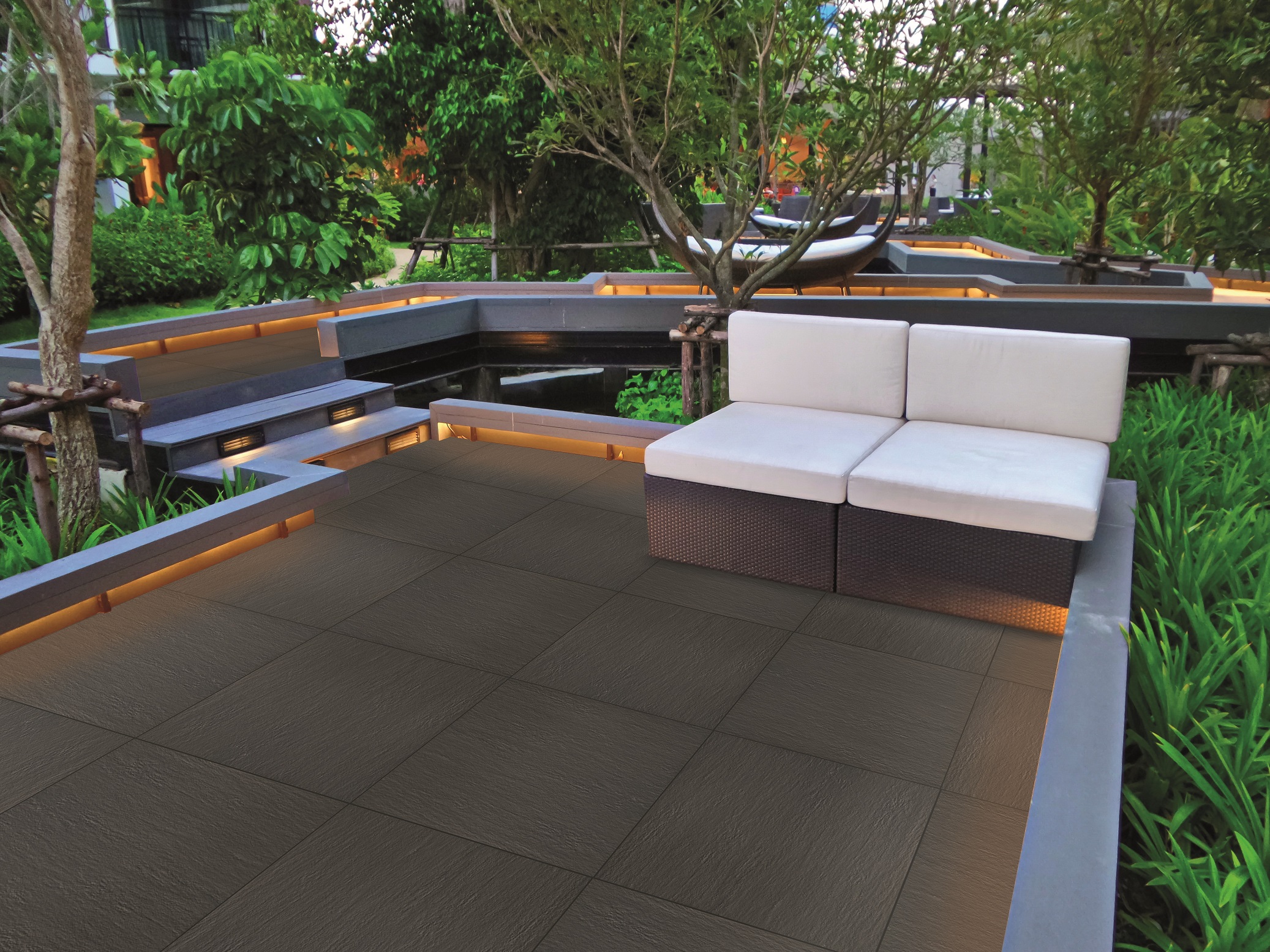 Sort, keramisk haveflise med skiferligenende udtryk og naturtro look. Let ruflet og skridsikker overflade.