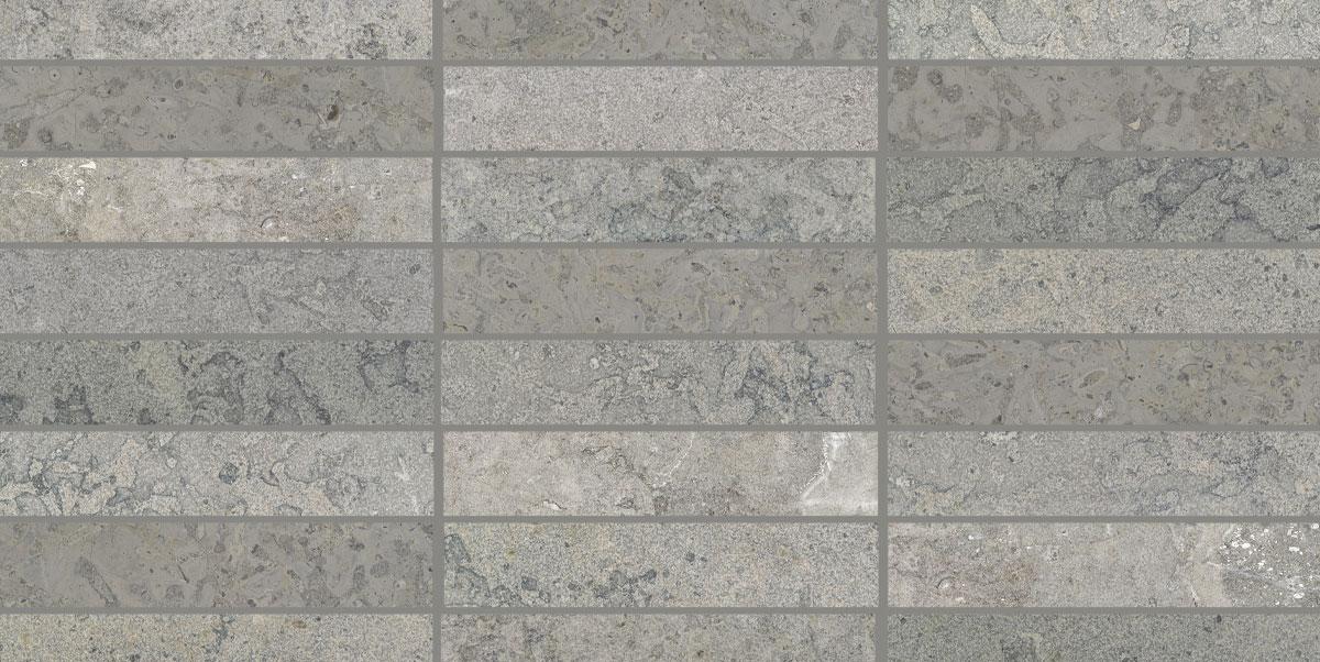 Keramisk flise/stav i lys grå Mineral Steel. Flisen kan bruges til diverse mønstre på væg eller på gulv - f.eks. elegant sildebensmønster. Hver flise måler 38,5 x 7,5 x 0,9 cm.