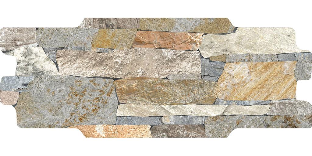 Vægpanel i varme lyse nuancer Vulcan Sahara med dekorativ rustik overflade. Denne flise er produceret i et keramisk materiale og er dermed et rigtig godt alternativ til natursten, da fliserne er frostsikre og dermed kan holde til at blive monteret som dekorativ vægpanel både inde og ude.