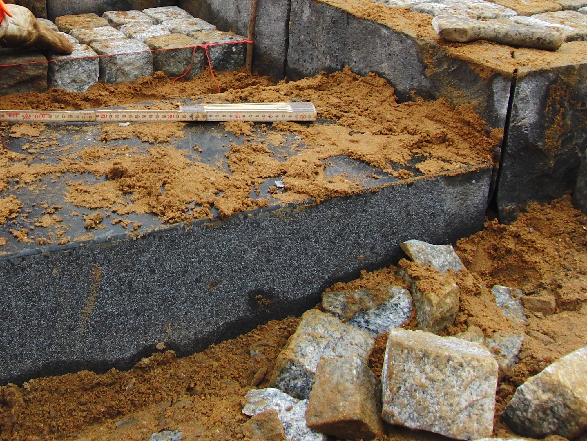 Flisesand til afretning under trapper, brosten og chaussésten.