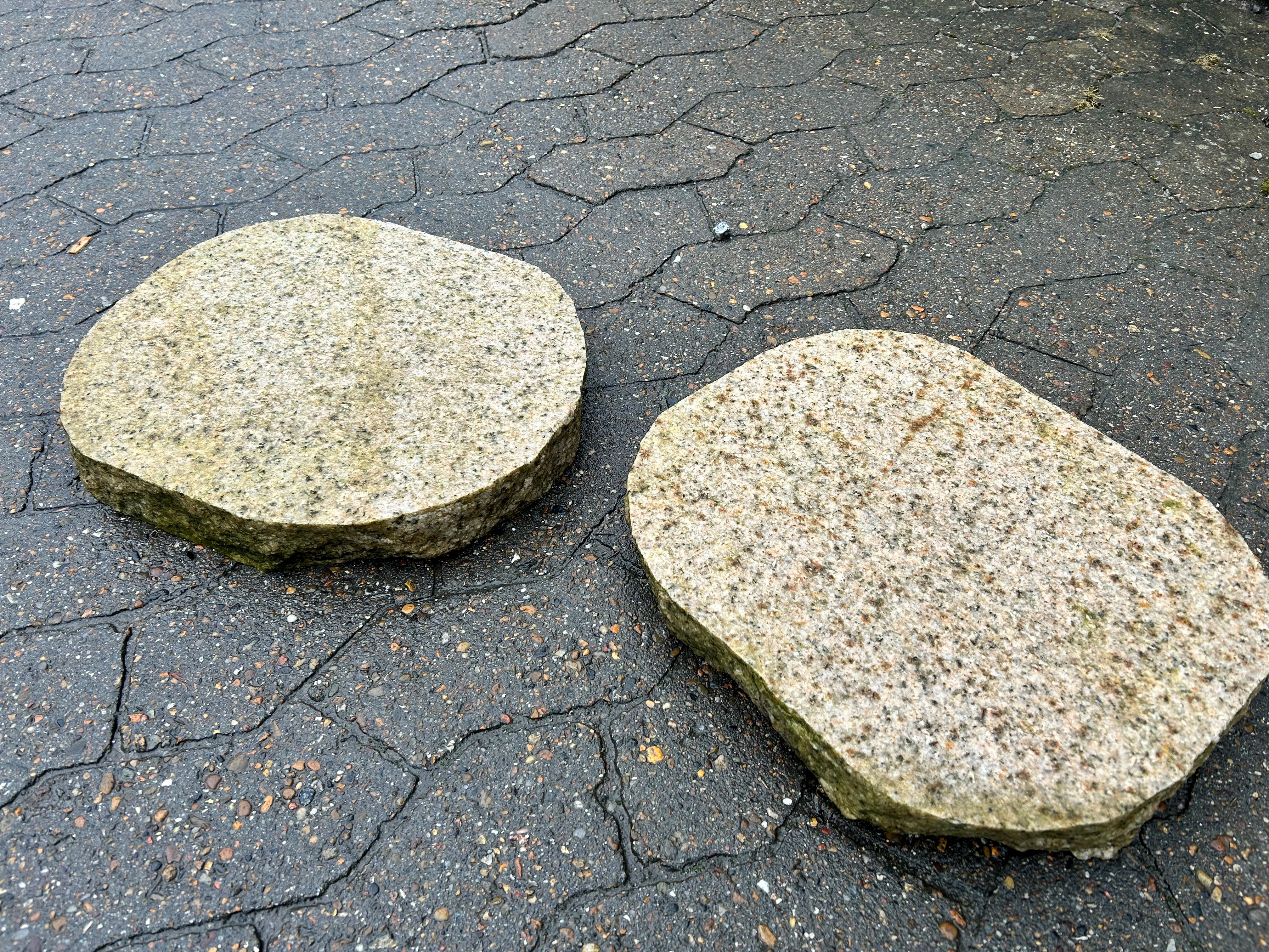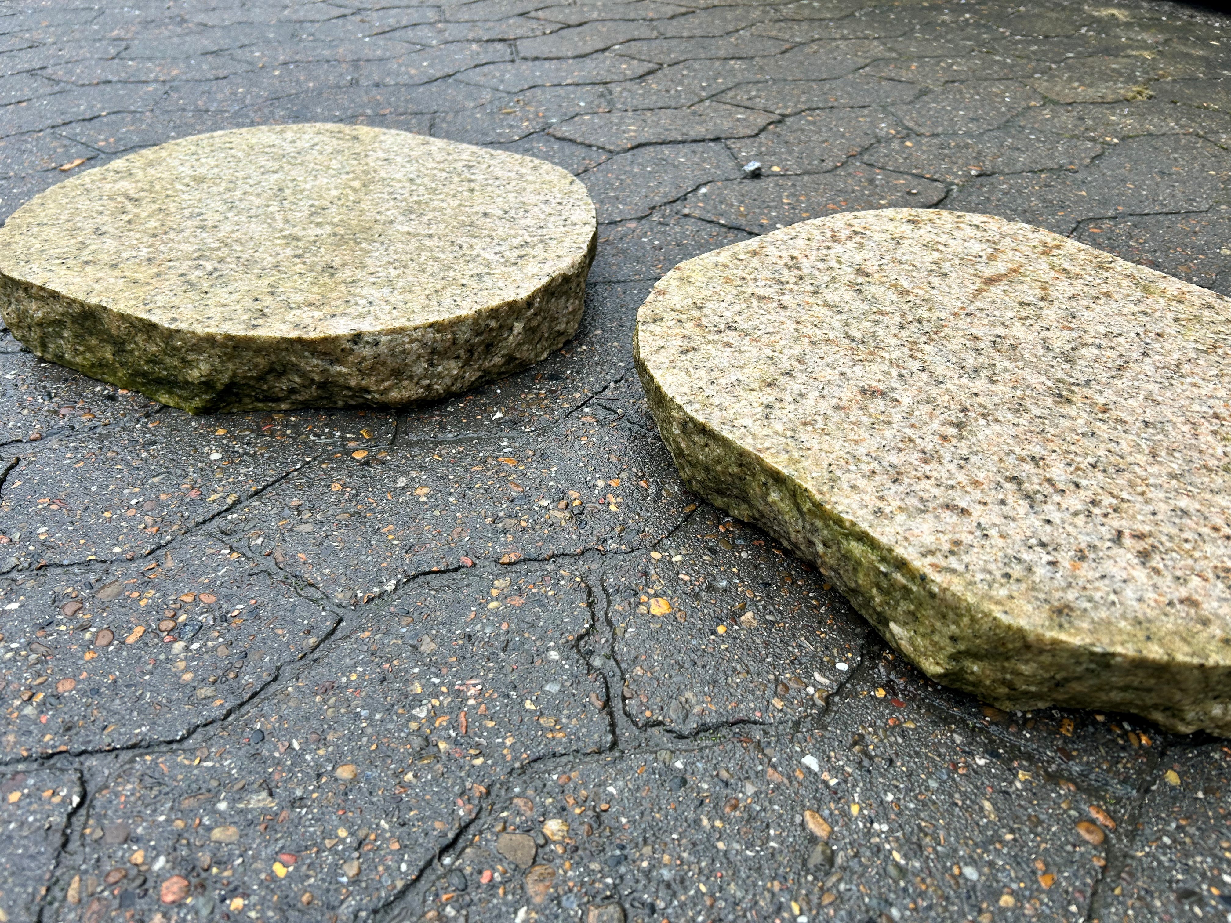 Trædesten i gul granit med skridsikker overflade. Trædestenen måler ca. 30 x 35 x 5 cm med kløvede kanter og jævn overflade.