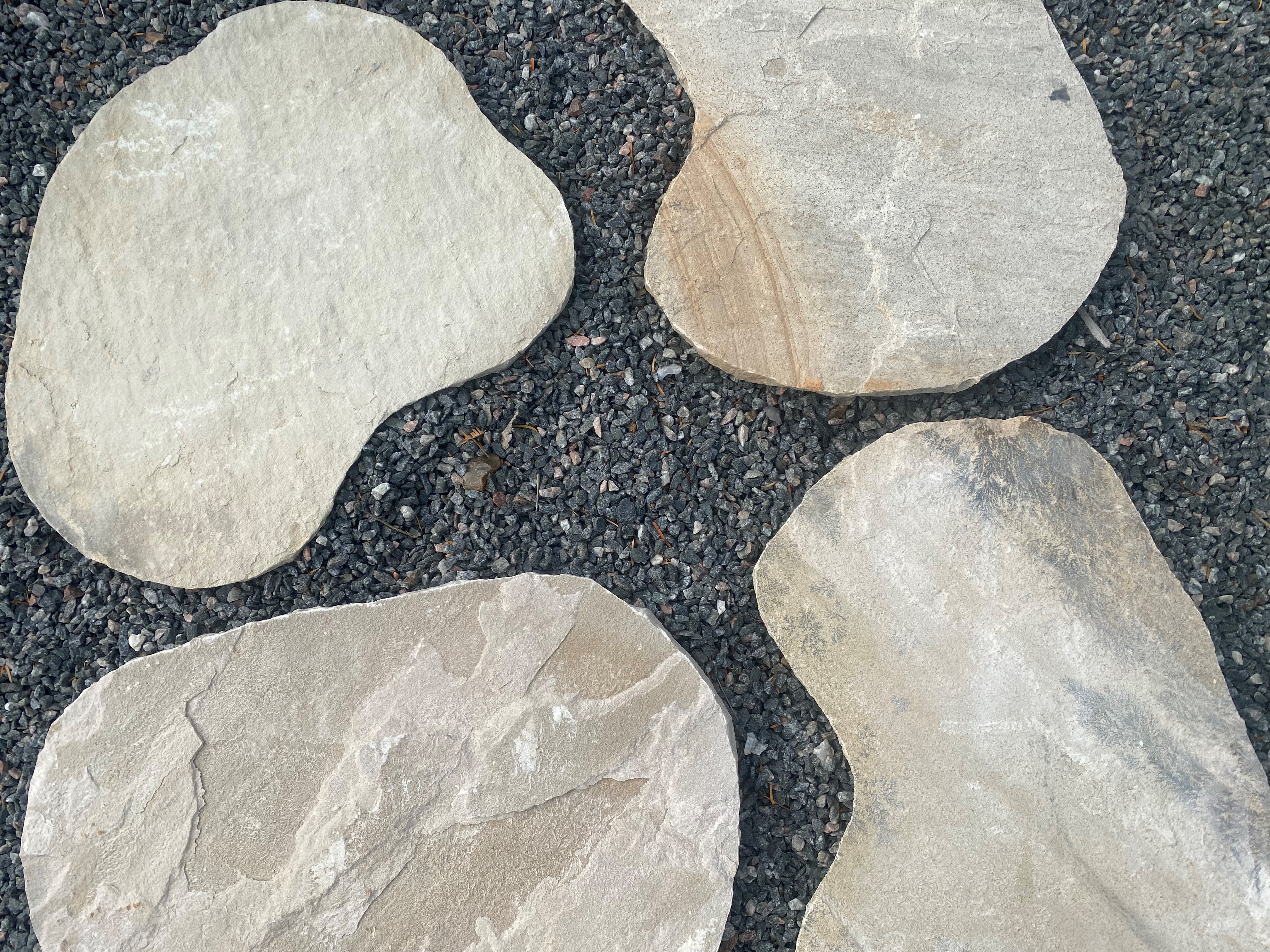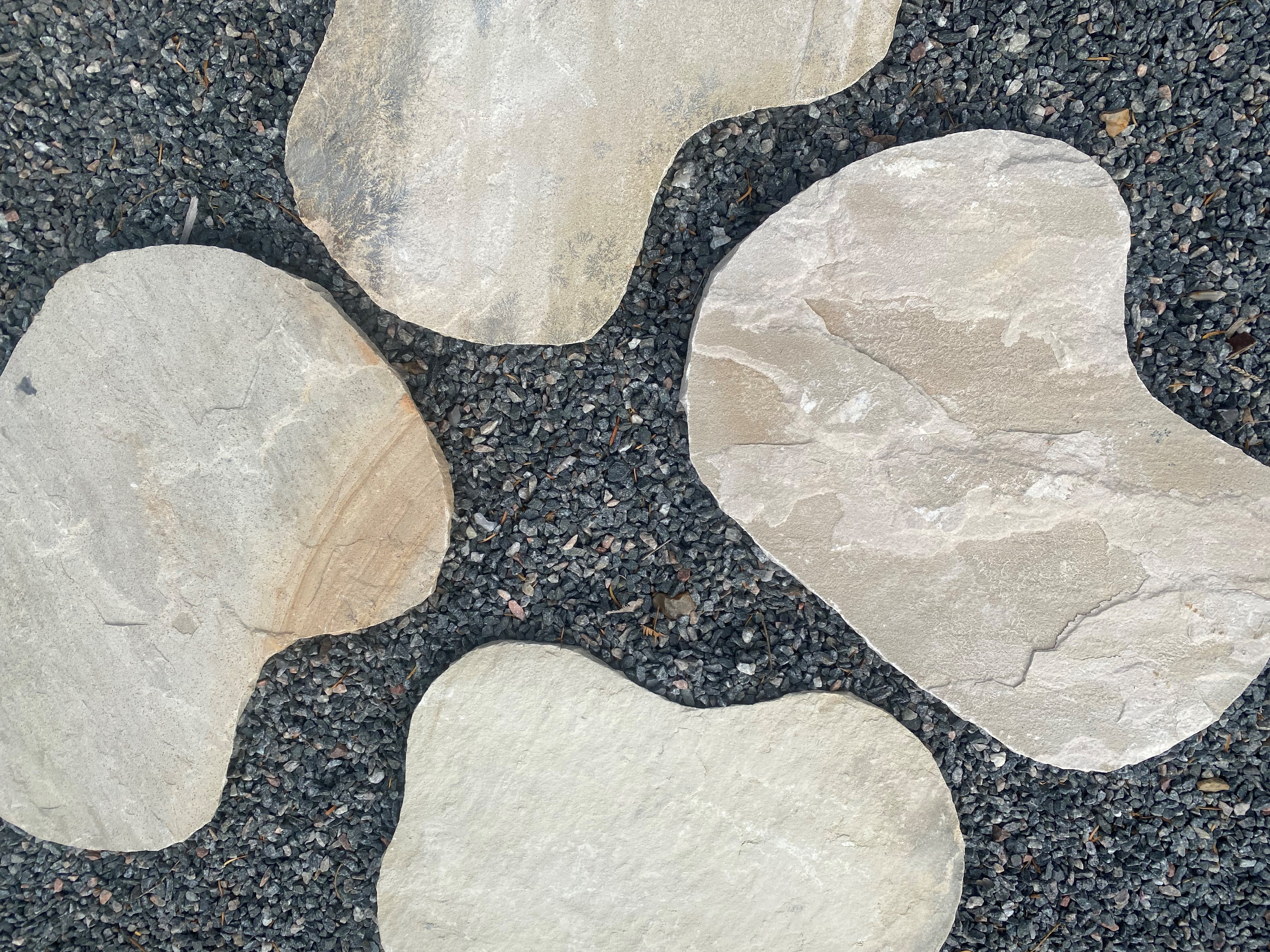 Trædesten Crazy Mint i lys skifer. Rustik kløvet overflade. Rigtig fine trædesten i irregulære former.