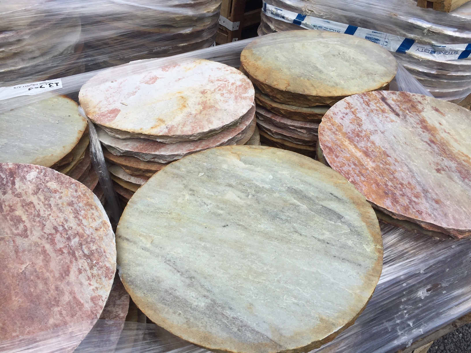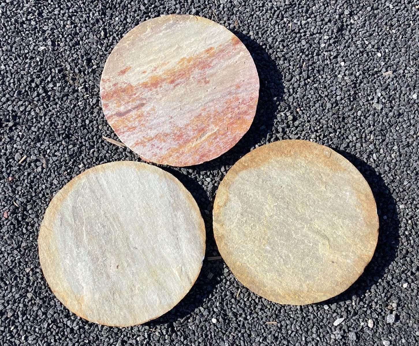 Rund skifer trædesten i skønne varme farvenuancer. Quarzit skifer. Lav spændende trædesti i græsplænen eller havebedet.