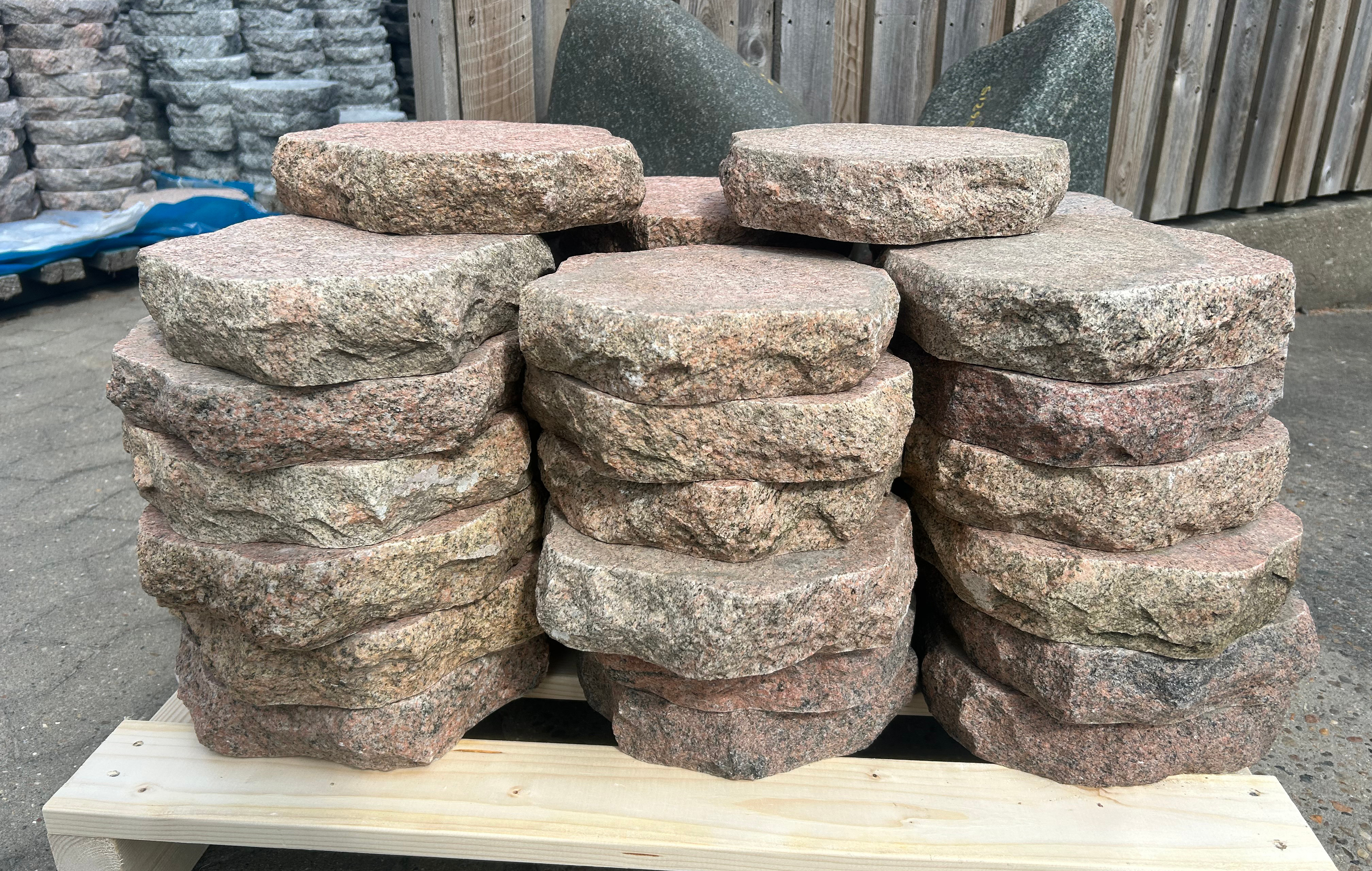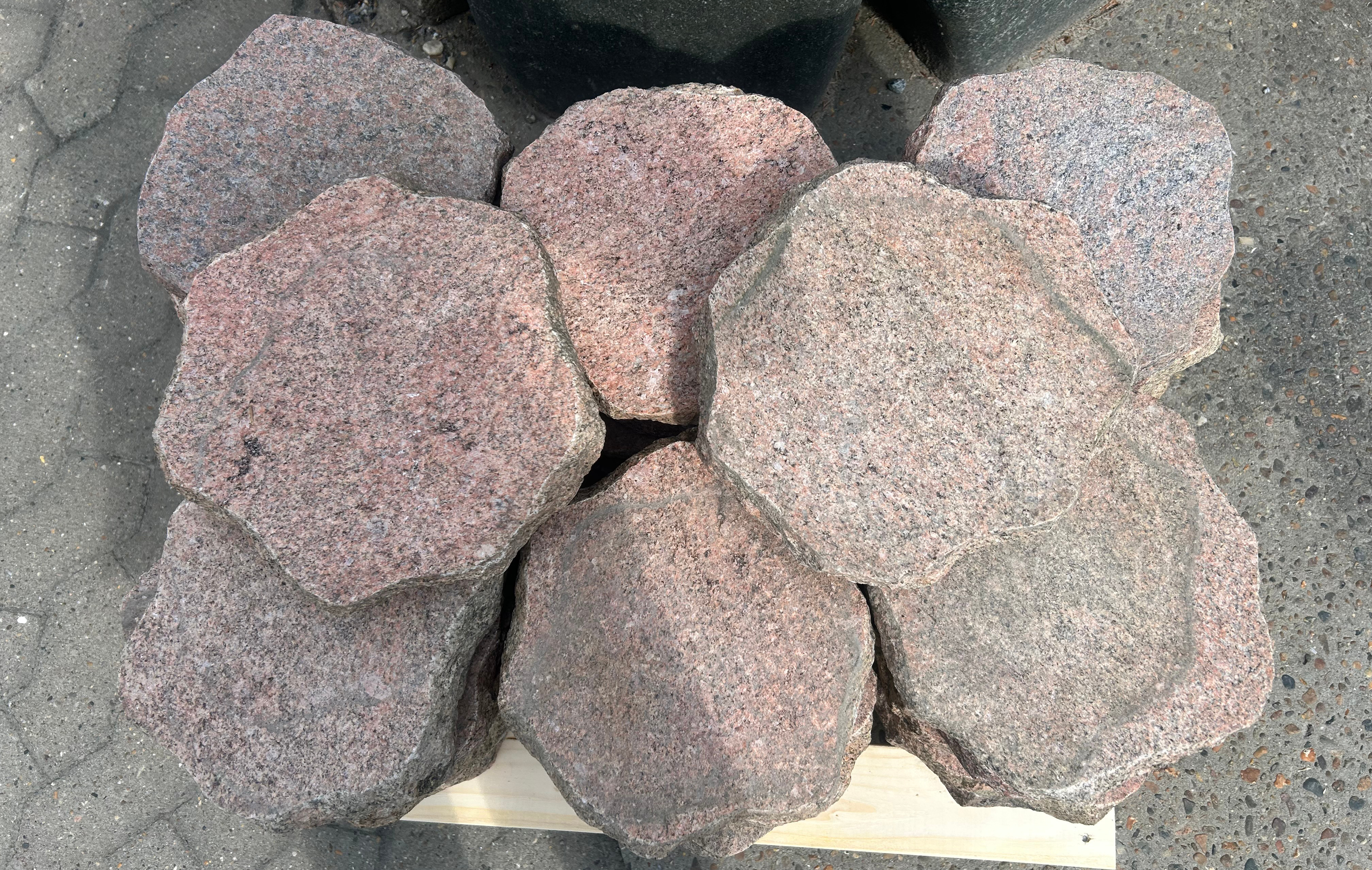 Trædesten med brændt overflade og råkløvede kanter i en rød indisk granit.