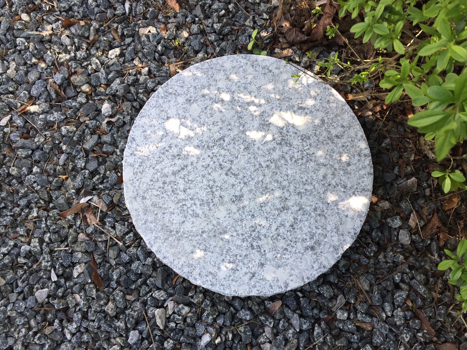 Rund trædesten i lys grå granit med jetbrændt, skridsikker overflade. Kanter rustikke