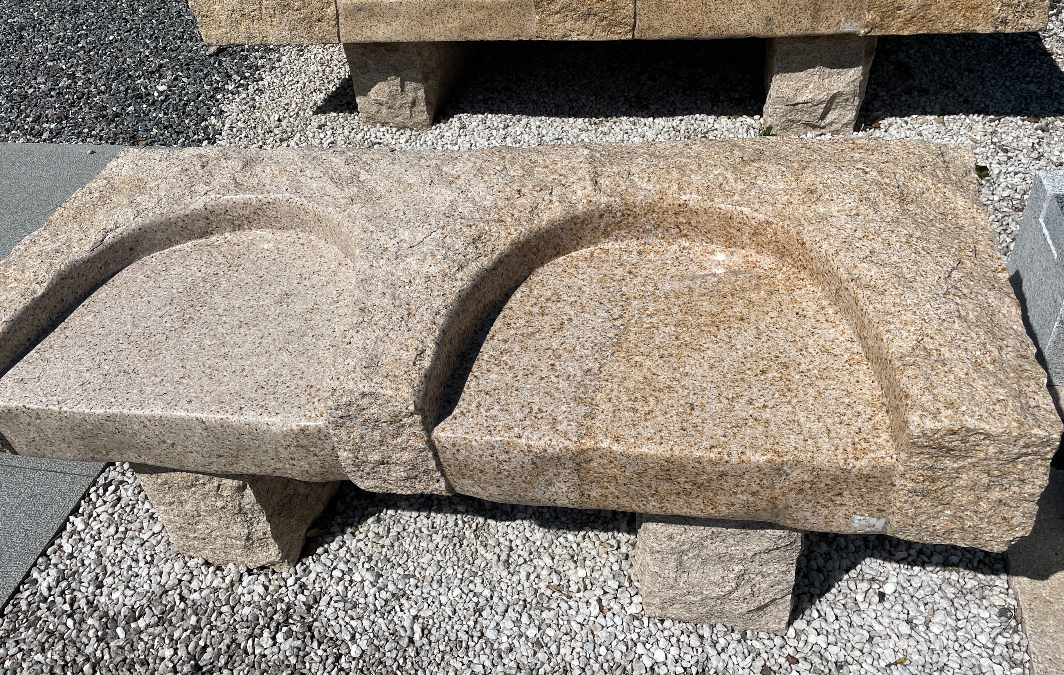 Bænk i gullig granit med udhugning som to sæder. Bænken er produceret som en skive granit hvor der er udhugget og poleret to siddepladser. Selve sædet har en glat overflade, som gør at den er nem at tørre af.