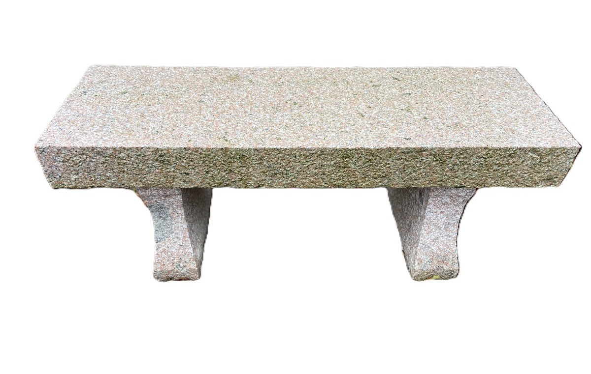 Solid bænk lavet i rosa eller grå granit. Bænkens overflade er ru både på ben og sæde, men stadig behagelig at sidde på. Den er stor nok til, at to personer kan sidde ved siden af hinanden og nyde solens stråler eller en kop kaffe.