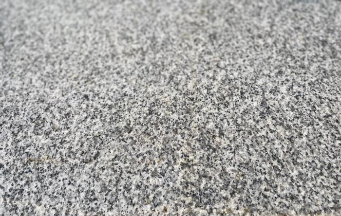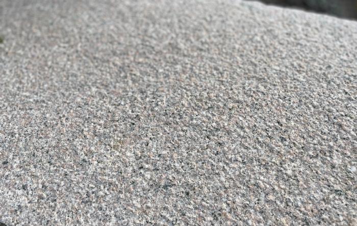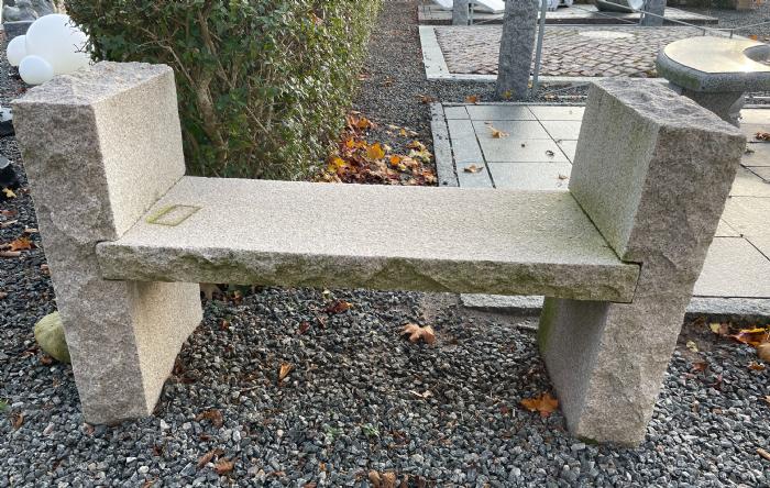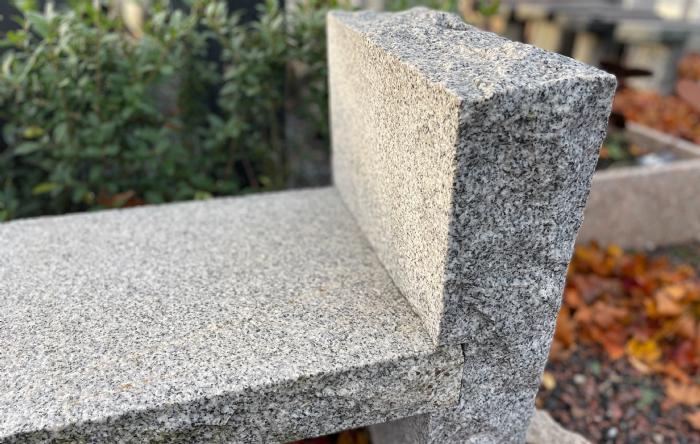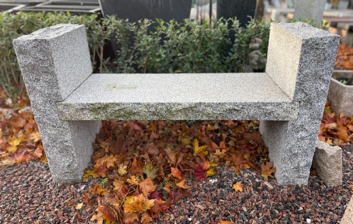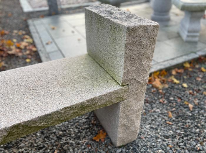 Bænk i lysgrå og rosa granit med grovhuggede sider og stokhugget sæde.