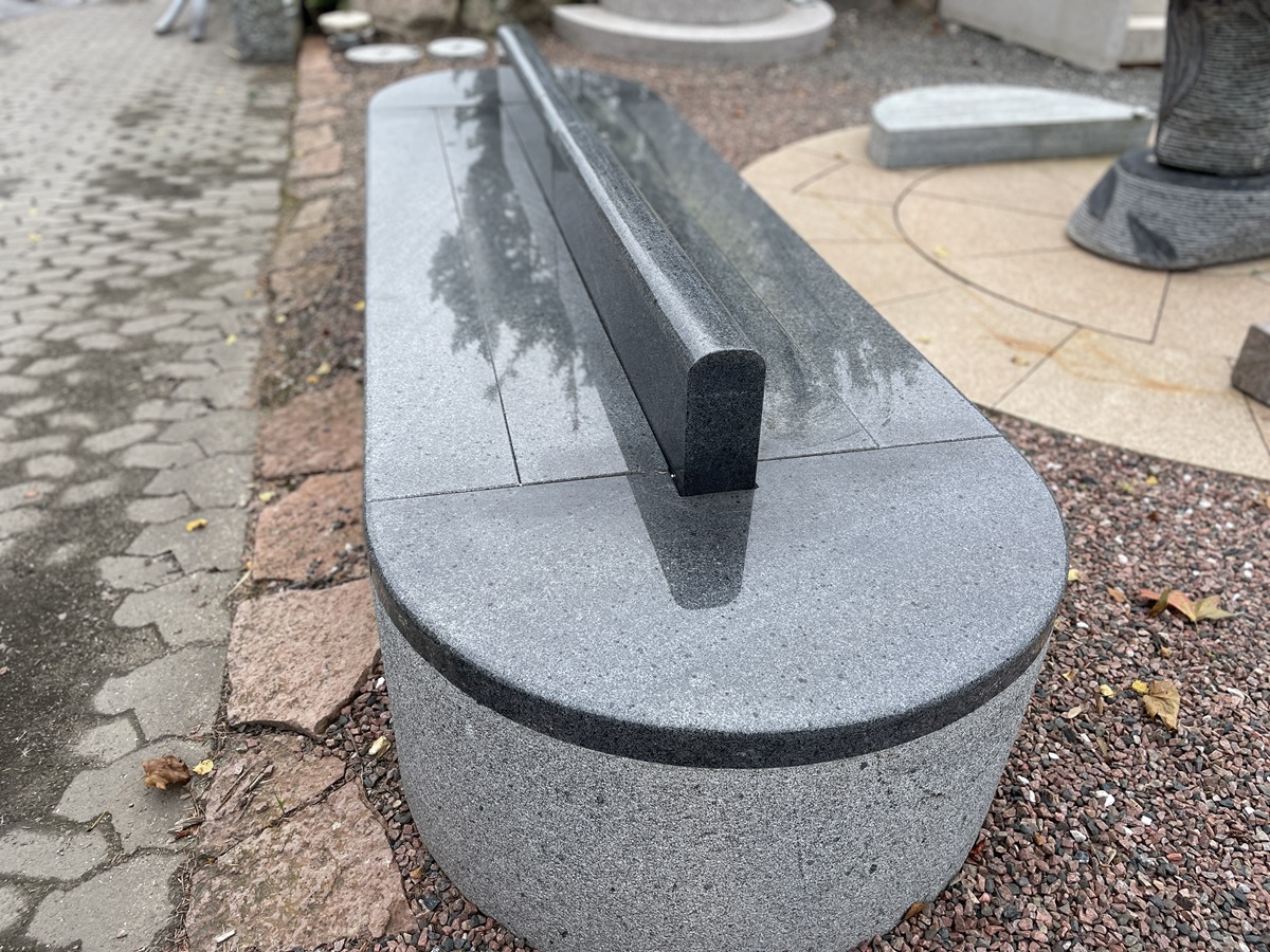 Granitbænk fremstillet af gråsort granit og har et moderne design. Den lange bænk er udformet med bløde, afrundede hjørner, hvor sæde og ryglæn har en glat, poleret overflade, mens benene/bund har en rå og naturlig struktur.