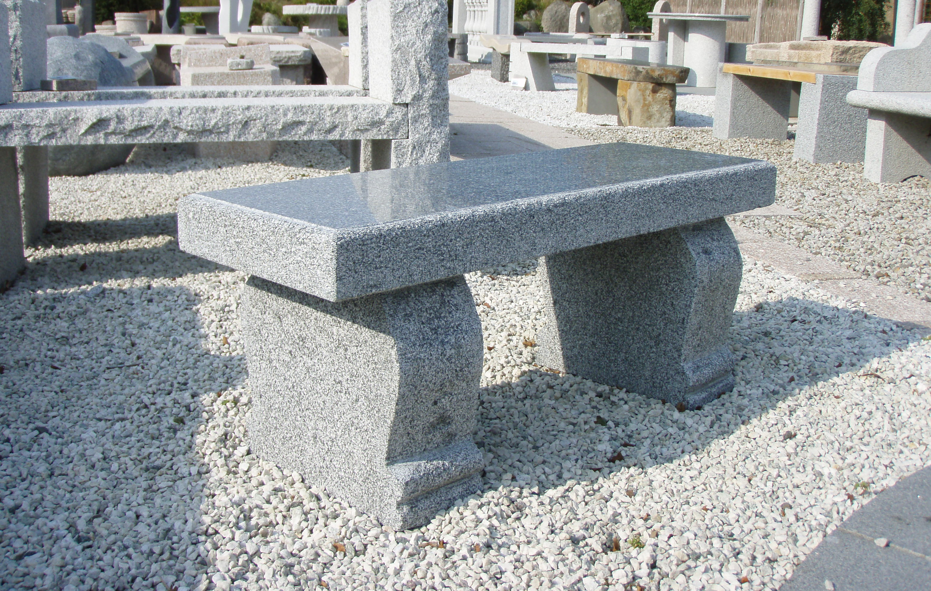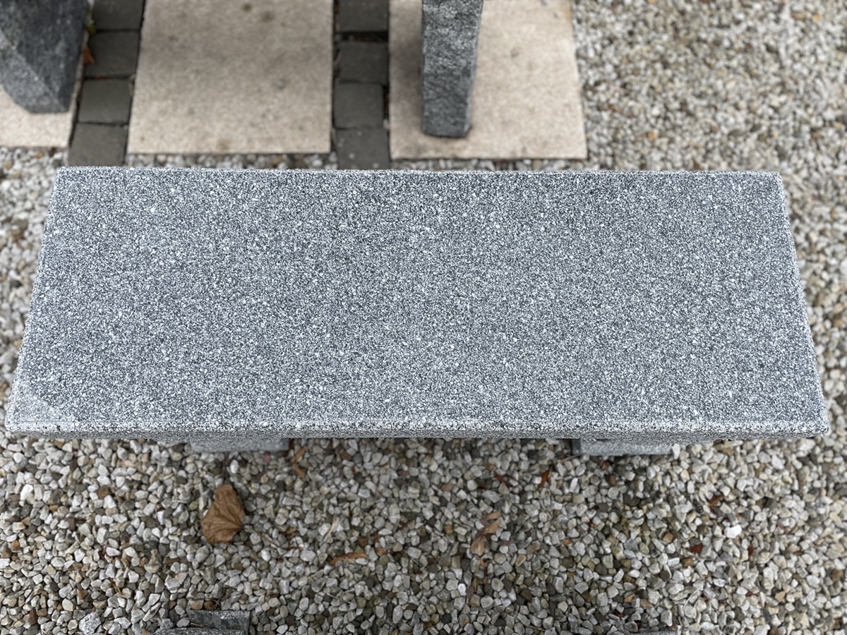 Granitbænk lavet i gråsort granit, med poleret sæde og brændte sider. Den polerede top frembringer granittens flotte farvespil og variation, som står i god kontrast til de rå sider.
