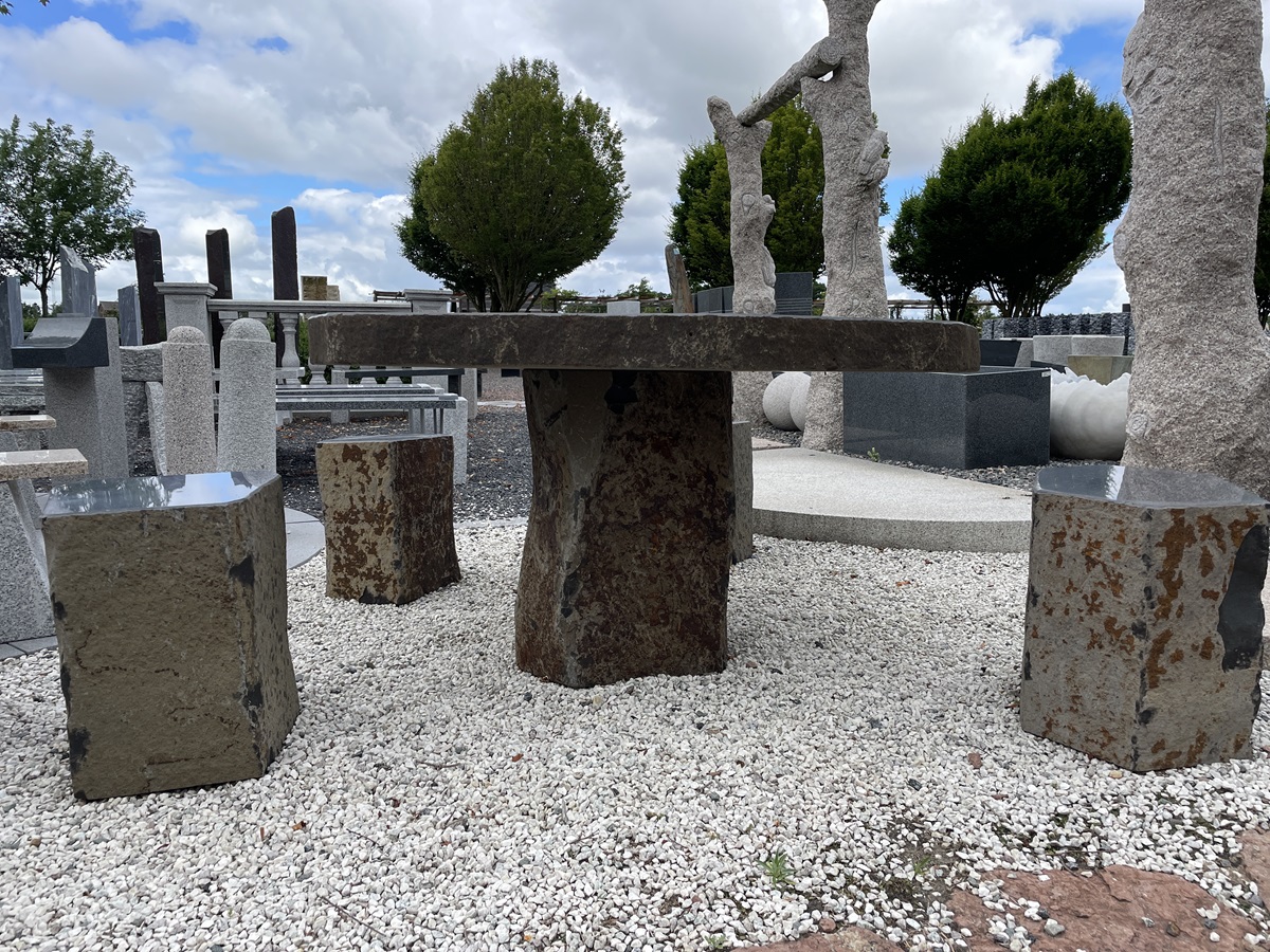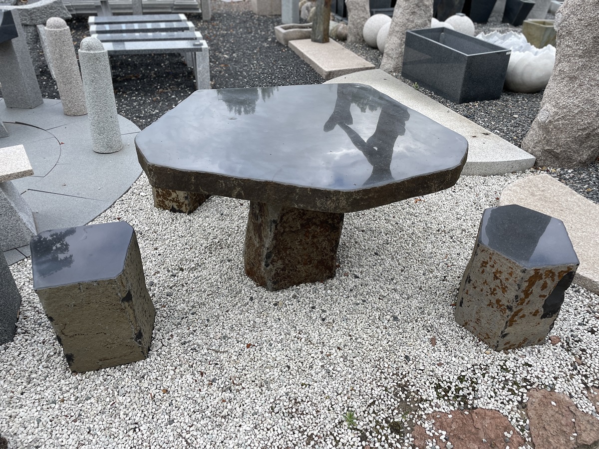 Sort basaltbord med taburetter - med poleret top og rå sider.