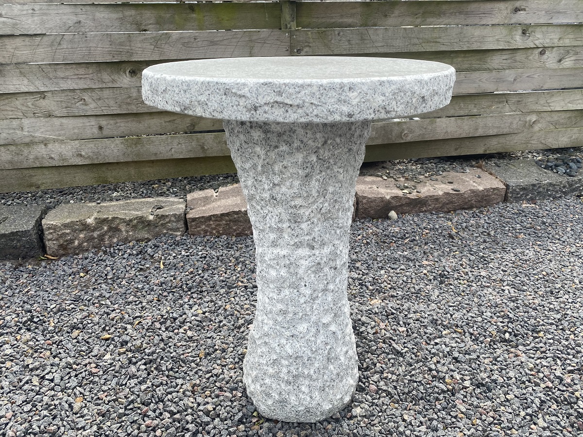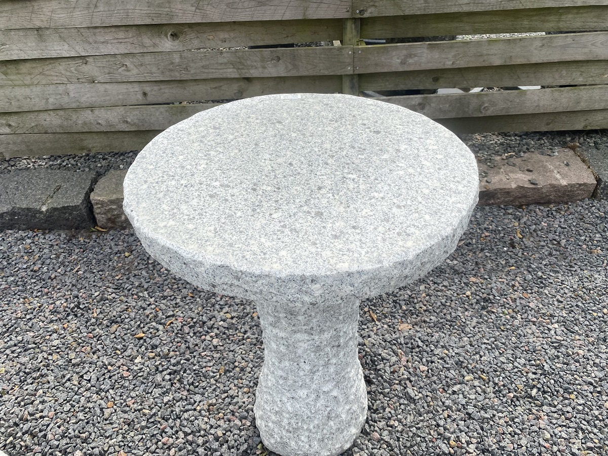 Cafébord i lysegrå granit. Bordet er velegnet til et lille sted i hjørnet af haven hvor der lige er plads til et par stole og dette mindre bord. Bordet er todelt, hvilket vil sige at plade og sokkel er hver for sig. Ønsker man et mere stabilt bord, kan man med fordel give det lidt polymerlim ved montering så de to dele limes sammen.
